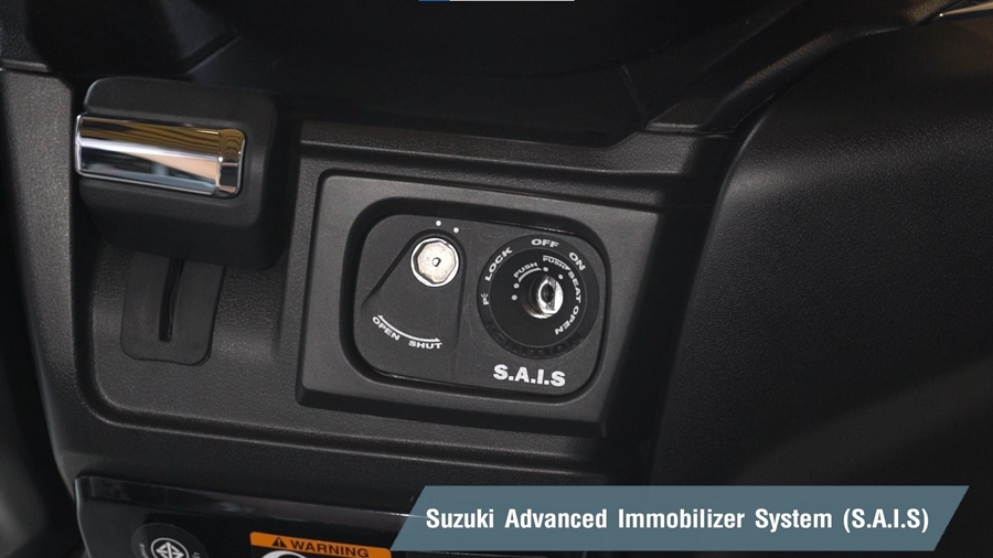 New Suzuki Burgman 400 ด้วยระบบกุญแจนิรภัยแบบแม่เหล็กพร้อมระบบกุญแจ Suzuki Advanced Immobilizer System ซึ่งเป็นกุญแจเอกสิทธิ์เฉพาะไม่ส่ามารถปลอมแปลงรหัสจากกุญแจชุดอื่นได้ Suzuki Easy Start System สตาร์ทรถด้วยระบบช่วยสตาร์ท Suzuki Easy Start System โดยแค่เบรกค้างไว้แล้วกดปุ่มสตาร์ทเพียง 1 ครั้ง ที่พักเท้าด้านหน้าถูกออกแบบตามหลักสรีระศาสตร์เพื่อให้ผู้ขับขี่มีความสบายสูงสุด ลดอาการเมื่อยล้าขณะขับขี่ โดยออกแบบให้มีส่วนเว้าท าให้ผู้ขับขี่ขยับขาออกจากที่พักเท้าลงพื้นได้อย่างง่ายดาย นอกจากนั้นเบาะนั่งมีความสูงจากพื้นเพียง 755 มม. ซึ่งต่ำที่สุดในรถจักรยานยนต์ในประเภทเดียวกัน