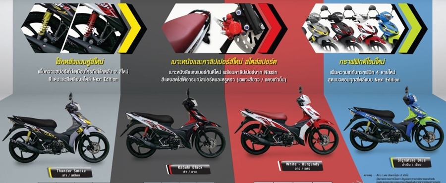 ด้านโช้คหลังแบบคู่สีใหม่ เพิ่มความสปอร์ตไม่เหมือนใคร กับ 2 สีใหม่ สีแดง สีเหลืองสไตล์ Next Edition , เบาะหนังและคาลิปเปอร์สีใหม่ สไตล์สปอร์ตจาก Nissin สีแดงสดใส (เฉพาะสีขาว/แดงเท่านั้น) พร้อมเพิ่มความเท่กับสติ๊กเกอรฺ 4 ลายใหม่ สุดแนวตอบทุกสไตล์แบบ Next Edition