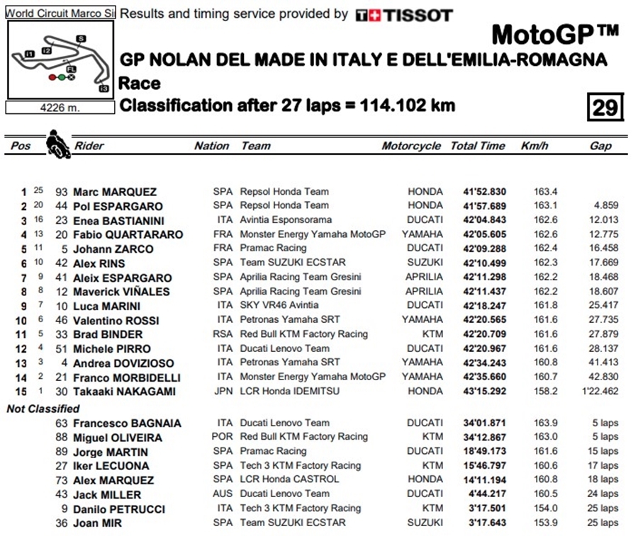 การแข่งขันรายการ Gran Premio Nolan del Made in Italy e dell'Emilia-Romagna ในสนาม Misano World Circuit Marco Simoncelli ในประเทศอิตาลี ในที่สุดก็ได้แชมป์โลกในรุ่น MotoGP เสียที หลัง Francesco Bagnaia จาก Ducati Lenovo Team เกิดพลาดหลุดออกจากการแข่งขันทำให้คะแนนสะสมประจำปีของเขากับ Fabio Quartararo จาก Monster Energy Yamaha MotoGP นั้นกว้างเกินกว่าจะไล่ตามทันใน 2 สนามที่เหลือเลยส่งผลให้ Quartararo คว้าตำแหน่งแชมป์โลกในรุ่น MotoGP 2021 ไปครองได้ ส่วนแชมป์ประจำสนามนี้ตกเป็นของ Marc Marquez จาก Repsol Honda Team ส่วนที่ 2 เป็นเพื่อนร่วมทีมอย่าง Pol Espagaro ที่ขึ้นมาคว้าโพเดี้ยมแรกในสีเสื้อ Honda ด้านที่ 3 Enea Bastianini จาก Avintia Esponsorama ที่สามารถแซง Quartararo ได้ในรอบสุดท้ายนับเป็นโพเดี้ยมที่ 2 ของ Bastianini แต่วันนี้เป็นวันของ Quartararo