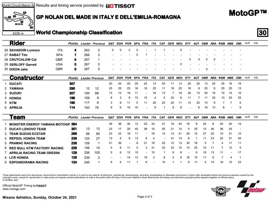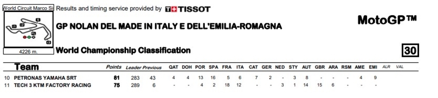 ด้าน Valentino Rossi จาก Petronas Yamaha SRT ถึงแม้จะเข้าเส้นชัยในอันดับที่ 10 ก็ถือว่าเป็นการคว้าแต้มในรุ่น MotoGP ในการแข่งขันครั้งสุดท้ายของเขาบนแผ่นดินอิตาลี ต่อหน้าแฟนๆ ของแชมป์โลก 9 สมัย ท้านที่สุดคือขอแสดงความยินดีกับ Fabio Quartararo จาก Monster Energy Yamaha MotoGP และ Yamaha ที่มีฤดูกาลที่เหลือเชื่อจนสามารถคว้าแชมป์โลก MotoGP 2021 มาครองได้สำเร็จ