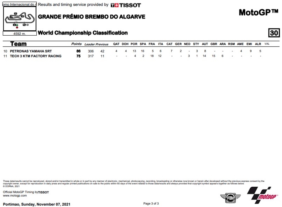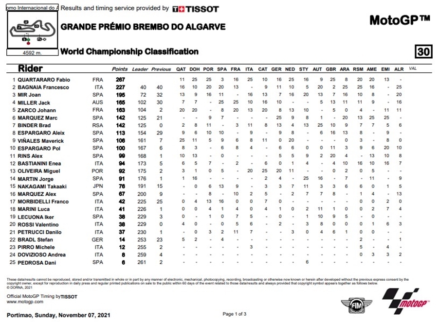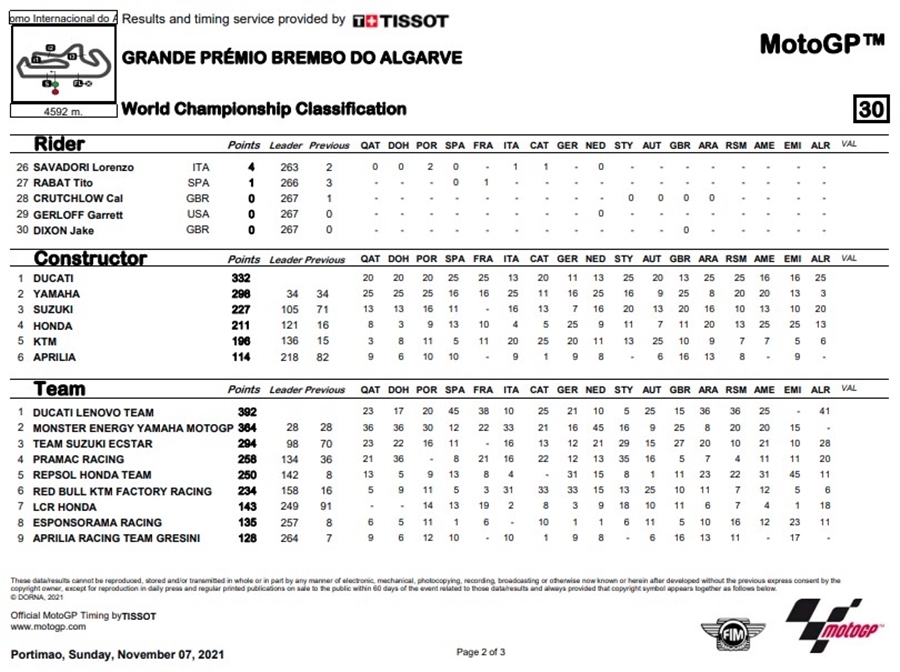 ชัยชนะของ Bagnaia นั้นทำให้ Ducati รับตำแหน่งแชมป์ประจำปีประเภทผู้ผลิตในปีนี้ หลังจากที่ Bagnaia ต้องอกหักในการชิงตำแหน่งแชมป์โลก ส่วน Alex ถึงแม้จะพลาดโพเดี้ยมแต่ก็เป็นผลงานที่ดีที่สุดของฤดูกาลของเขา ตอนนี้เหลือแค่ตำแหน่งแชมป์ประเภททีมที่ยังเหลือให้ Ducati Lenovo Team และ Monster Energy Yamaha MotoGP นั้นช่วงชิงกันในสนามสุดท้ายของปี 2021 ในรายการ Gran Premio Motul de la Comunitat Valenciana ที่สนาม Circuit Ricardo Tormo ในสเปน