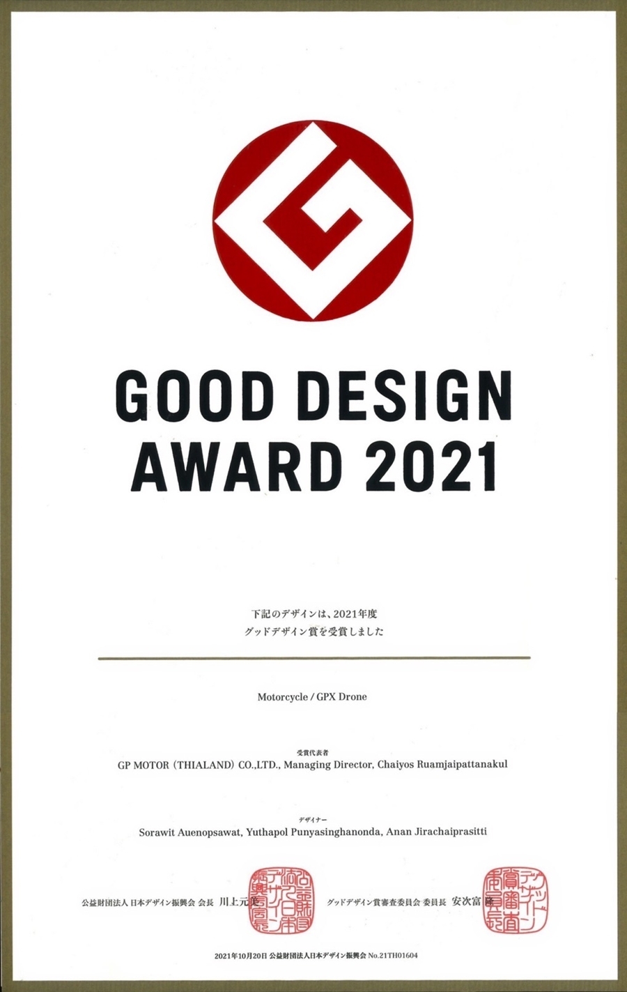 เป็นที่ทราบกันดีอยู่แล้วว่ารถ GPX DRONE มีความโดดเด่นนอกจากทางด้านสมรรถนะแล้ว ยังมีงานดีไซน์เส้นสายบนตัวรถที่มีความเฉียบคม สะดุดตา จนทำให้รถรุ่นนี้สามารถสร้างกระแสตอบรับเป็นอย่างดีได้ตั้งแต่เปิดตัวเป็นครั้งแรกจนถึงปัจจุบันที่พัฒนามาเป็นรุ่น 4 วาล์วแล้ว ก็ยิ่งเพิ่มความน่าสนใจให้กับรถรุ่นนี้มากขึ้นไปอีก ซึ่งถ้าจะพูดถึงในเรื่องของการออกแบบตัวรถรุ่น GPX DRONE หลายคนอาจจะยังไม่ทราบว่าเป็นผลงานการออกแบบโดยฝีมือทีมงาน GPX R&D คนไทย ที่สามารถสร้างชื่อเสียงจากการคว้ารางวัลผลงานออกแบบดีเด่น จากเวทีการประกวด Good Design Awards 2021 หรือ G-Mark มาครอบครอง ซึ่งถือเป็นประตูสำคัญสู่การแข่งขันในระดับสากลอีกด้วย