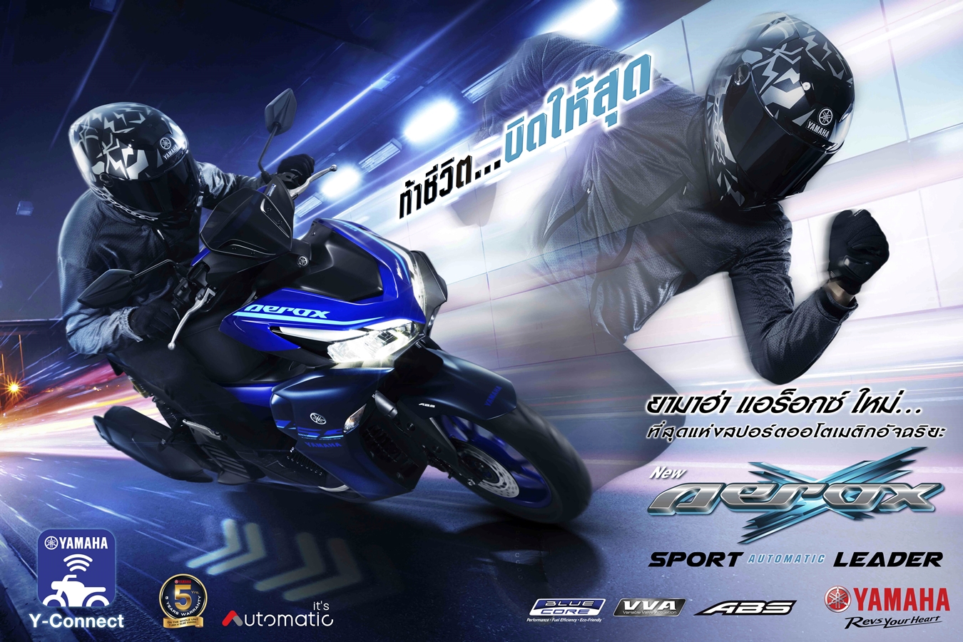 บริษัท ไทยยามาฮ่ามอเตอร์ จำกัด ตอกย้ำความเป็นผู้นำรถจักรยานยนต์ออโตเมติกส่ง New YAMAHA AEROX ท้าชีวิต…บิดให้สุด Spice up your challenge ! ดีไซน์สปอร์ตรอบคัน ดุดันตามแบบฉบับรถ Super Sport ตระกูล R-Series สมรรถนะทรงพลังด้วยความแรงจากเครื่องยนต์บลูคอร์ 155 ซีซี ผสานวาล์วแปรผันอัจฉิรยะ VVA พร้อมเทคโนโลยีใหม่ Y-Connect เชื่อมต่อข้อมูลรถเพื่อตอบสนองในการใช้งานมั่นใจในการรับประกันมากกว่า ถึง 5 ปี หรือ 50,000 กิโลเมตร