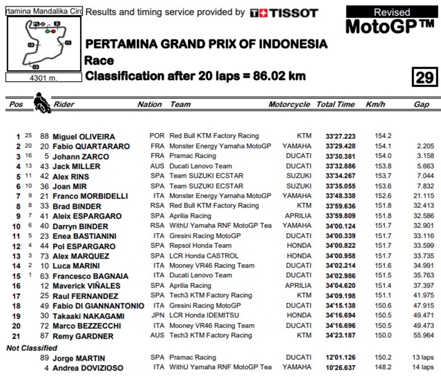 ในช่วงสุดท้าย Oliveira ที่ยังคงนำแต่เหมือนจะผ่อนเรซลงทำให้เวลาที่นำอยู่นั้นถูกทอนลงมาเล็กน้อย แต่นั่นก็ไม่ทำให้เจ้าตัวกังวลสามารถเข้าเส้นชัยในสนาม Pertamina Mandalika Circuit เพื่อคว้าชัยชนะให้กับทีม Red Bull KTM Factory Racing เป็นครั้งแรกในปี 2022 ฝั่ง Quartararo ก็จบการแข่งขันด้วยอันดับที่ 2 และ Zarco ก็คว้าที่ 3 ไปครองได้สำเร็จ น่าเสียดายสำหรับ Miller ที่มักทำได้ดีในสนามเปียกกลับจบที่อันดับ 4 พลาดตกโพเดี้ยมไปอย่างน่าเสียดาย