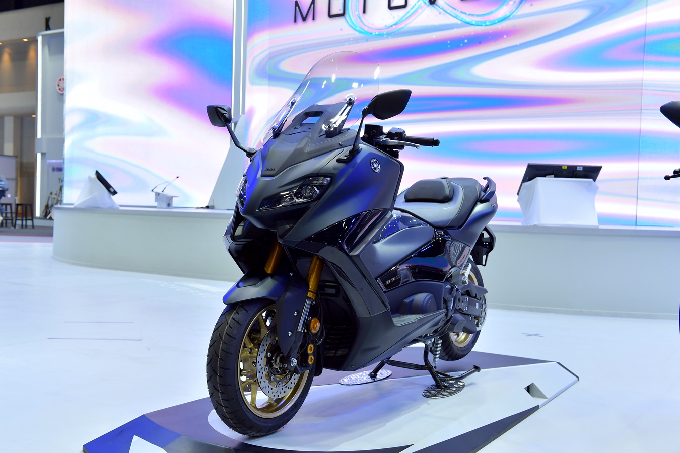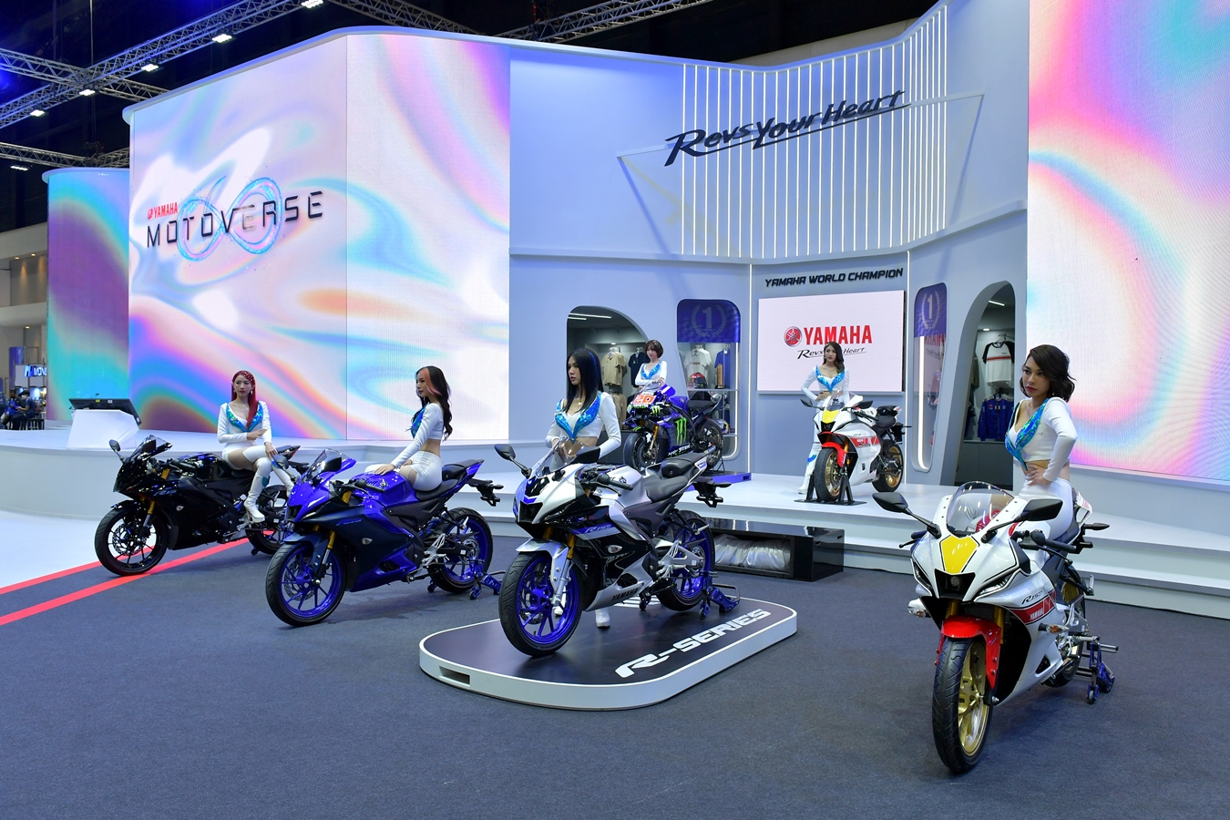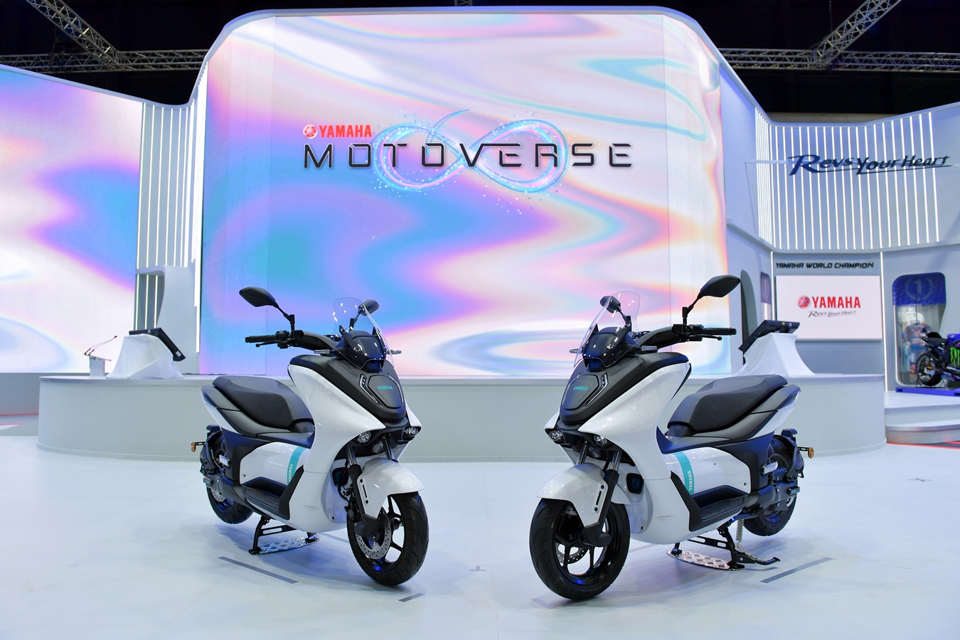 บูธ YAMAHA MOTOVERSE มีการนำจอ 3 มิติมานำเสนอ เพื่อให้ผู้ชมภายในงานได้สัมผัสกับประสบการณ์สุดล้ำจากยามาฮ่าครั้งแรกในมอเตอร์โชว์ บนพื้นที่ 1,000 ตารางเมตร ขนาดใหญ่ที่สุดในโซนรถจักรยานยนต์ พร้อมนำเสนอผลิตภัณฑ์ที่หลากหลาย เพื่อให้เข้าถึงทุกความต้องการของลูกค้า และสร้างภาพลักษณ์ตราสินค้าที่แข็งแกร่งมากขึ้น โดยได้จัดแสดงรถจักรยานยนต์ออกเป็น Series พร้อมนวัตกรรมรถ EV สุดล้ำ พร้อมโมเดลใหม่ ถึง 6 รุ่น และอีก 1 สเปเชี่ยล อิดิชั่น ดังนี้