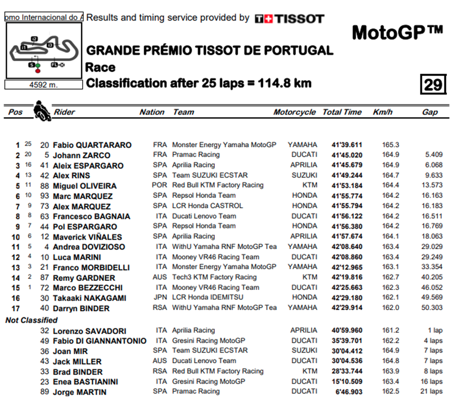 Rins สร้างผลงานได้อย่างน่าทึ่งถึงแม้จะพลาดโพเดี้ยม แต่ก็จบการแข่งขันในอันดับที่ 4 โดยออกสตาร์ทในอัดับที่ 23 ถึงแม้จะพลาดโพเดี้ยมแต่ก็รั้งคะแนนสะสมเทียบเท่ากับ Quartararo ด้านนักบิดเจ้าถิ่น Miguel Oliveira จาก Red Bull KTM Factory Racing คว้าอันดับ 5 ในบ้านเกิด