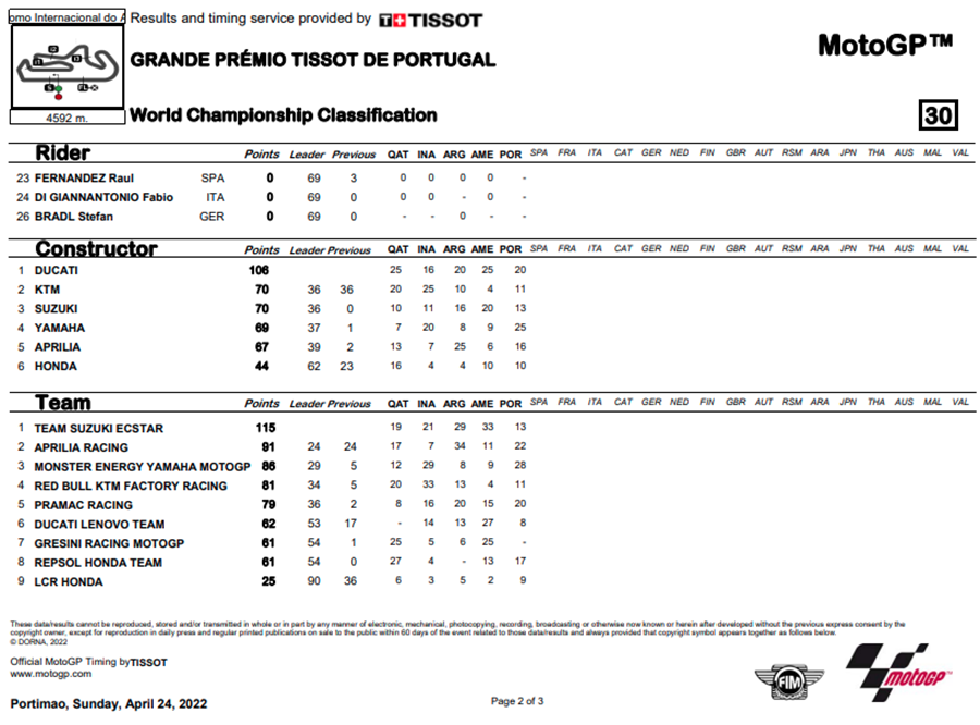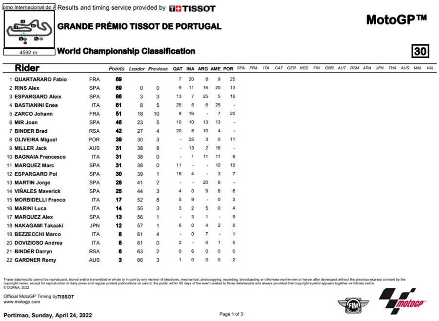 การแข่งขัน MotoGP เดินทางมาถึงสนามที่ 5 แล้วในรายการ Grande Premio Tissot de Portugal ในสนาม Autodromo Internacional do Algarve ในรอบควอลิฟายผู้ที่ได้ตำแหน่งโพลก็คือ Johann Zarco จากทีม Pramc Racing แต่พอในรอบการแข่งขันก็เป็น Fabio Quartararo ทีม Monster Energy Yamaha MotoGP ที่ทำผลงานออกมาได้ดีกว่าจนสามารถคว้าชัยครั้งแรกในปี 2022 ไปได้ในที่สุด ด้าน Zarco ก็สามารถขึ้นโพเดี้ยมในอันดับที่ 2 ขณะที่ Aleix Espargaro ทีม Aprilia Racing จบการแข่งขันในอันดับที่ 3 ซึ่งผลการแข่งขันดังกล่าวส่งผลให้ Quartararo ขึ้นมาเป็นผู้นำคะแนนสะสมแม้ว่าจะมีคะแนนเท่ากันกับ Alex Rins จาก Team Suzuki Ecstar อยู่ที่ 69 คะแนนก็ตาม โดย Rins นั้นถือว่าทำผลงานได้ดีเยี่ยมเพราะออกสตาร์ทจากกลุ่มหลังแต่สามารถขึ้นมาจบการแข่งขันได้ในอันดับที่ 4