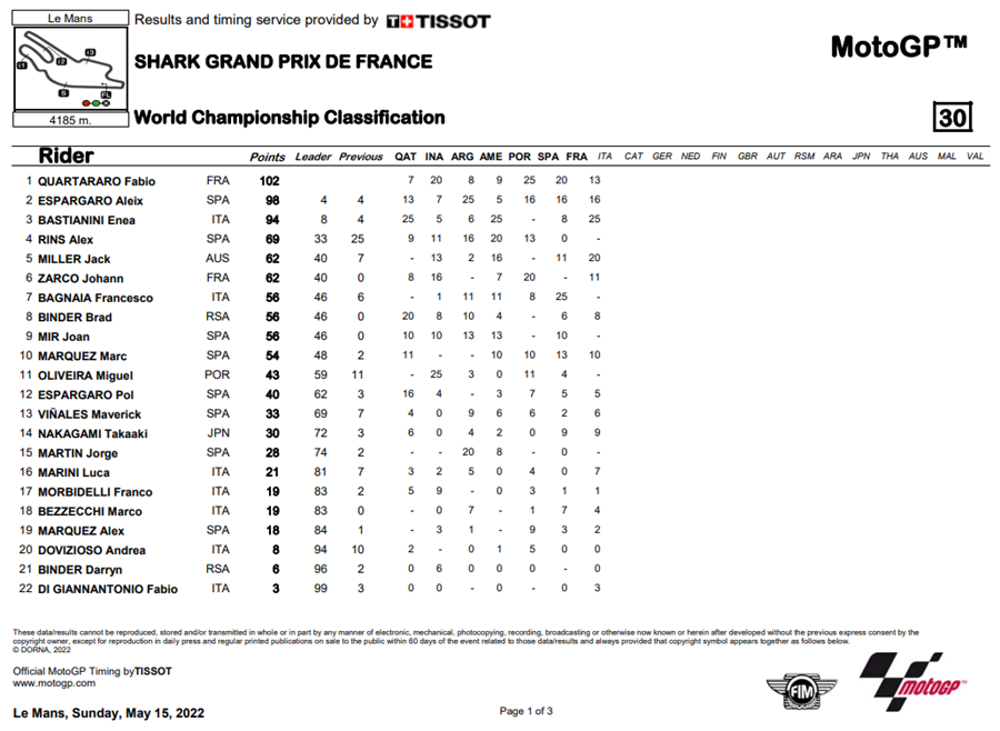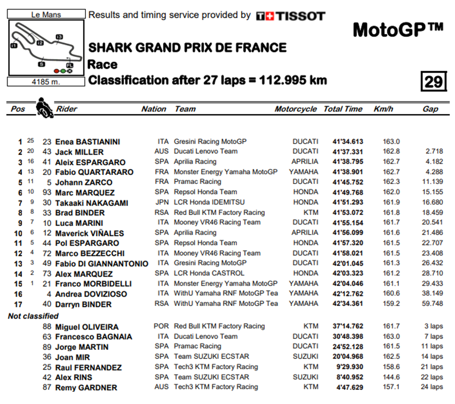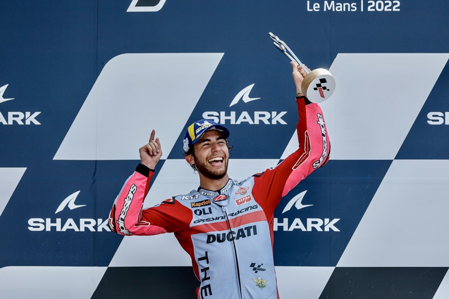 ชัยชนะในรายการ SHARK Grand Prix de France ในสนาม Le Mans ประเทศฝรั่งเศส ตกเป็นของ Enea Bastianini จาก Gresini Racing MotoGP ที่สามารถโชว์ฟอร์มการขับขี่ได้อย่างไร้ที่ติต่อหน้าผู้ชมกว่า 110,000 คน ในขณะแข่งขันนั้นตำแหน่งผู้นำเป็นของ Pecco หรือ Francesco Bagnaia จาก เกือบจะตลอดการแข่งขัน แต่จุดเปลี่ยนก็เกิดขึ้นเมื่อ Pecco พลาดล้มและออกจากการแข่งขันไป ขณะที่ Jack Miller ทีมเมทของ Pecco ยังคงดีพอที่จะรักษาโพเดี้ยมในอันดับที่ 2 โดยมี Aleix Espargaro จาก Aprilia Racing รั้งตำแหน่งที่ 3