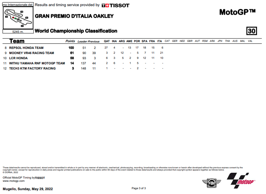 Francesco Bagnaia ของทีม Ducati Lenovo Team คว้าชัยได้ใน Gran Premio d’Italia Oakley ที่สนาม Autodromo Internazionale del Mugello ถึงแม้ว่าอันดับจะตกไปอยู่ถึงที่ 10 แต่ก็ค่อยๆ ไต่อันดับขึ้นมาจนเป็นผู้ชนะการแข่งขันในที่สุด เป็นการคว้า 25 แต้มสำคัญ เพื่อกลับมามีลุ้นในคะแนนสะสมชิงแชมป์โลก
