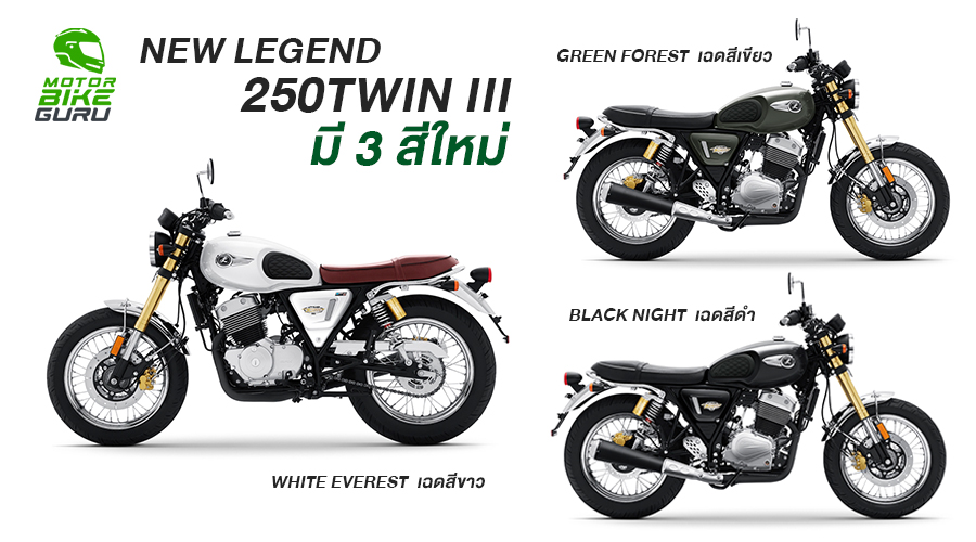 แบรนด์ไทยไปไกลระดับโลก GPX ซุ่มเงียบ เปิดตัวโฉมใหม่ NEW LEGEND 250TWIN III ( สองห้าศูนย์ ทวิน มาร์ก ทรี ) ครั้งแรกที่ญี่ปุ่น! ก่อนเปิดจำหน่ายในไทย ในคอลเลคชั่นสุดพิเศษ สู่แรงบันดาลใจในการเดินทาง กับ 3 เฉดสีใหม่ ได้แก่ BLACK NIGHT เฉดสีดำ , WHITE EVEREST เฉดสีขาว และ GREEN FOREST เฉดสีเขียว ที่มาพร้อมวงล้อแบบซี่ลวด ให้เหล่าไบค์เกอร์ได้สัมผัสกับอารมณ์ความคลาสสิกอย่างเต็มสูบ!
