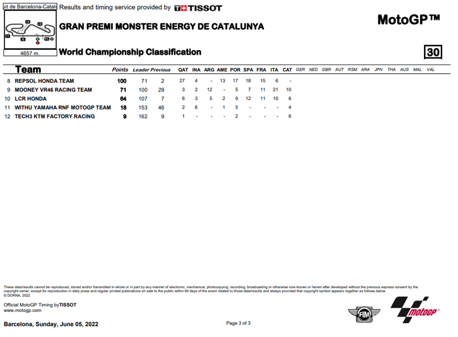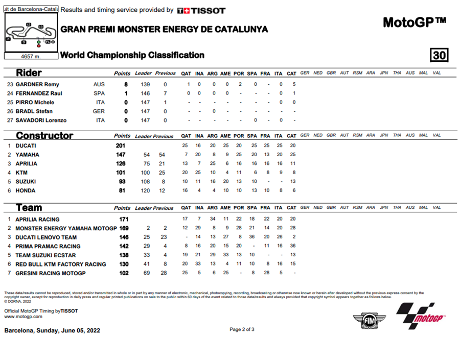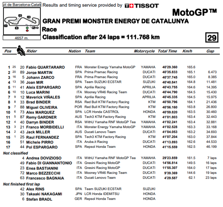 การแข่งขัน MotoGP ในสนามที่ 9 รายการ Gran Premi Monster Energy de Catalunya ที่สนาม Circuit de Barcelona-Catalunya ในสเปน เป็นสนามที่มีเรื่องดราม่าเกิดขึ้นมากมาย แต่สุดท้ายก็เป็น Fabio Quartararo จาก Monster Energy Yamaha MotoGP ที่สามารถคว้าชัยชนะอันสมบูรณ์แบบ แถมทำคะแนนสะสมทิ้งห่างออกไปถึง 22 คะแนน ส่วน Jorge Martin และ Johann Zarco จาก Prima Pramac Racing คว้าโพเดียมได้สำเร็จหลังจากความผิดพลาดอันน่าเหลือเชื่อของ Aleix Espargaro จาก Aprilia Racing จากการเข้าใจผิดในการนับรอบการแข่งขันทำให้อันดับตกลงไปถึงที่ 5