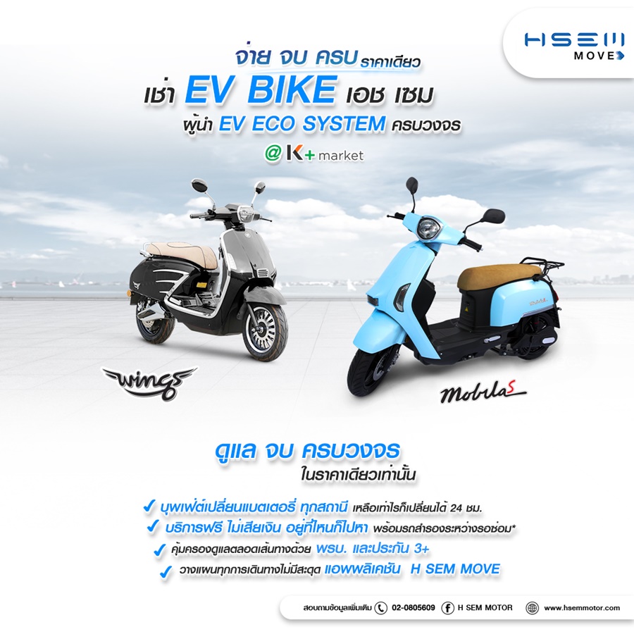 บริษัท เอช เซม มอเตอร์ จำกัด ขานรับการใช้งานของลูกค้าที่มีจำนวนเพิ่มมากขึ้นอย่างก้าวกระโดด ไม่ว่าจะเป็นจากเหล่าพี่ ๆ ไรเดอร์ ลูกค้าเช่าแบบธุรกิจ นิติบุคคลและบุคคลทั่วไป และเพื่อตอบโจทย์ที่มีความหลากหลายของการใช้งานให้กับลูกค้า จึงเปิดให้เช่ามอเตอร์ไซค์ไฟฟ้าเพิ่มอีก 2 รุ่นคือ H SEM MOBILA S และ H SEM WINGS ขับขี่ง่าย ไร้เสียง ไร้ควัน ไร้มลพิษ เริ่มต้นค่าเช่าแบบน่ารักๆ ผ่าน K+ Market เพียงวันละ 95 บาท สำหรับเช่า 30 วัน และวันละ 97.50 บาท สำหรับเช่า 15 วัน ตั้งแต่วันนี้ – 30 มิถุนายน 2565 นอกจากค่าเช่าที่เบาๆ นุ่มๆ แล้ว ค่าเช่านี้ เอช เซม ยังดูแลเรื่องงานบริการ มีรถสำรองใช้ระหว่างรอซ่อม ตลอด 24 ชม. เปลี่ยนแบตเตอรี่แบบไม่จำกัดจำนวนครั้ง ทุกสถานี ฟรีไม่มีค่าใช้จ่าย พร้อมประกันอุบัติเหตุ และ พรบ. อีกด้วย