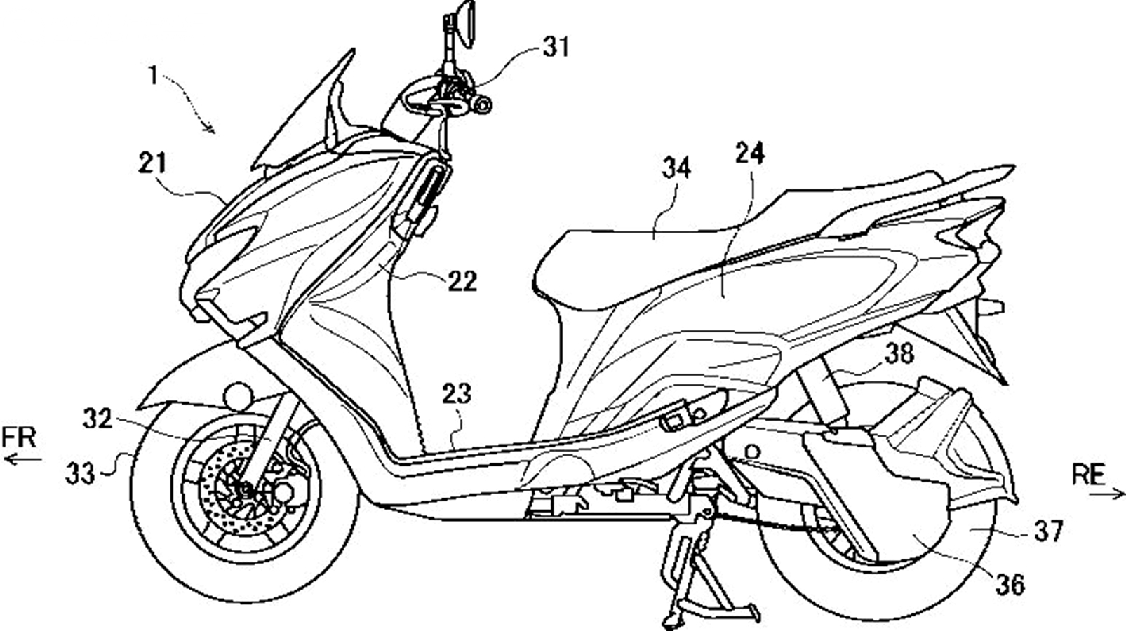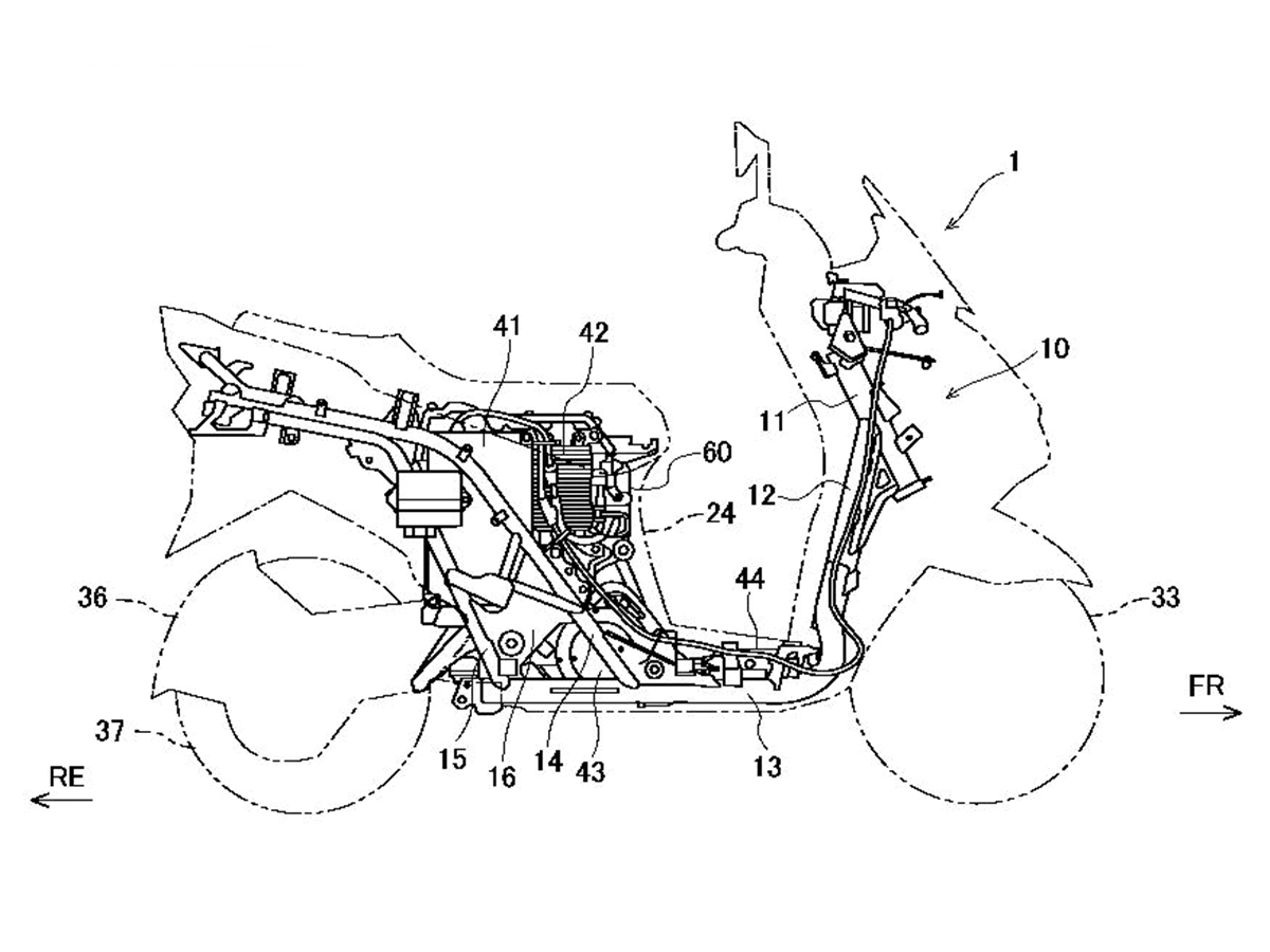 การจดสิทธิบัตรแสดงให้เห็นถึงโครงร่างตัวรถเบิร์กแมน 125 อีวี ซึ่งปกติขุมพลังเครื่องยนต์และระบบส่งกำลังจะยึดอยู่กับสวิงอาร์ม ทำให้มีพื้นที่ตรงกลางใต้เบาะเหลือมากพอติดตั้งถังน้ำมันและใส่ของ แต่ถ้าเป็น EV มอเตอร์กับสายพานขับเคลื่อนที่ล้อหลังจะยึดเข้ากับแชสซีส์เลย มอเตอร์ AC วางตำแหน่งไปทางด้านหน้าของเฟรม ต่้ำลงไปจากใต้เบาะนั่ง ส่วนตัวอินเวอร์เตอร์ DC-AC วางไว้ใต้ที่วางเท้าทำหน้าที่แปลงไฟ DC จากแบตเตอรี่เป็น AC เข้าสู่มอเตอร์ และยังมีตัวแปลง DC-DC ที่ติดไว้ขางแพคแบตเตอรี่เพื่อไว้คุมกระแสไฟ