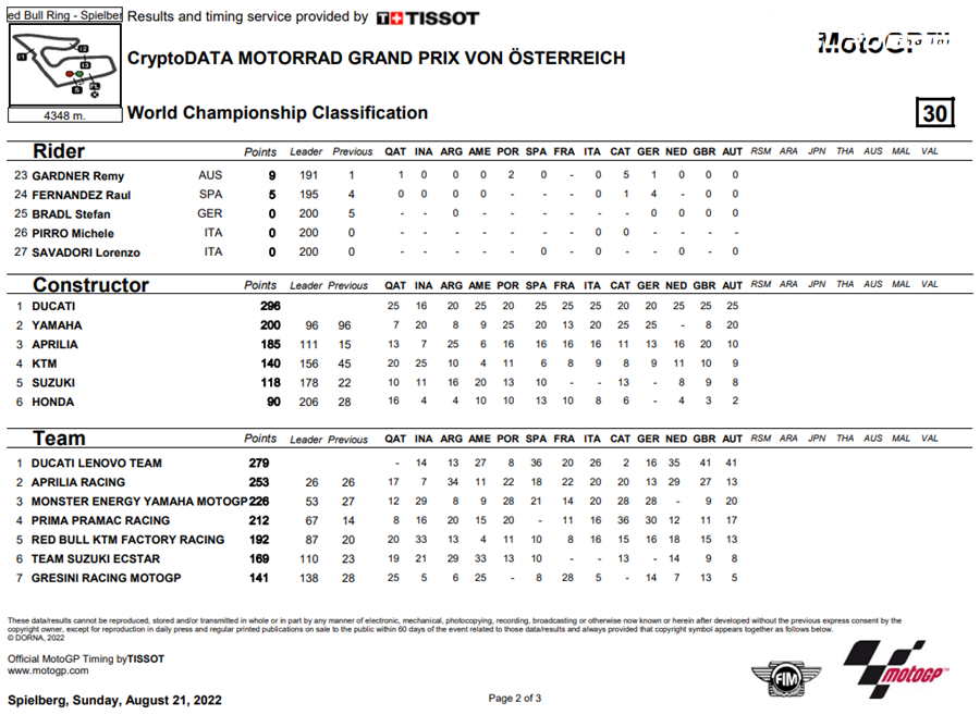 Francesco Bagnaia จาก Ducati Lenovo Team คว้าชัยในได้รายการ CryptoDATA Motorrad Grand Prix von Österreich ที่สนาม Red Bull Ring - Spielberg ในออสเตรีย โดยมี Fabio Quartararo จาก Monster Energy Yamaha MotoGP ผู้นำคะแนนสะสมประจำปี ตามมาเป็นอันดับที่ 2 ที่สามารถแซง Jack Miller จาก Ducati Lenovo Team ขึ้นมาได้แม้สนามนี้จะเข้าทางกับรถ Ducati มากกว่า Ysmaha ก็ตาม