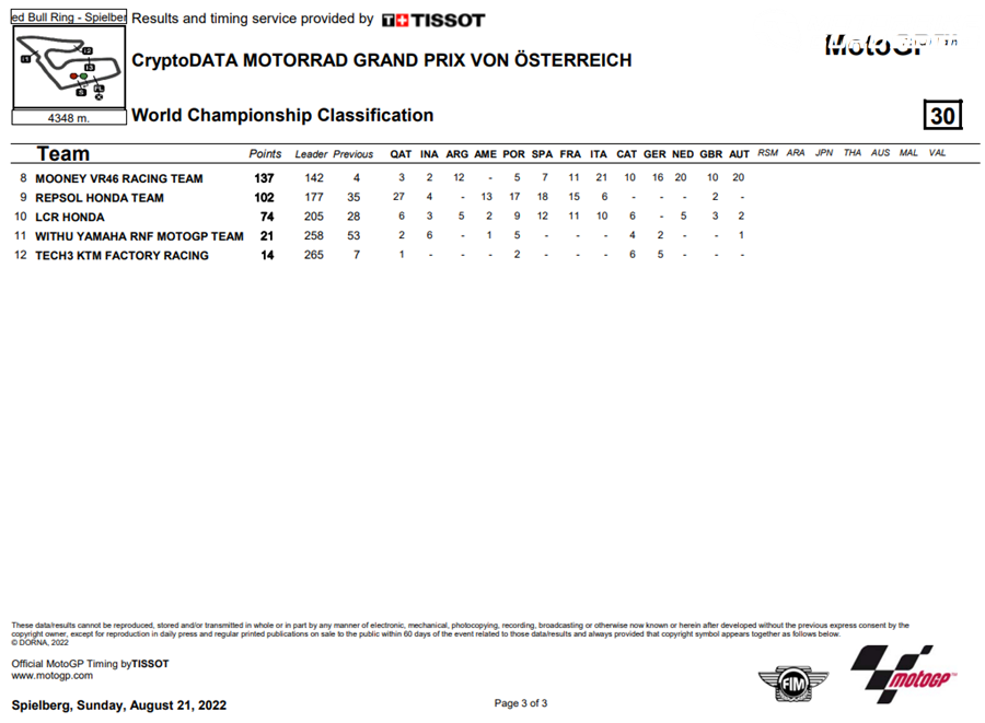 หลังผ่านธงหมากรุกถึงแม้ Bagnaia จะคว้าชัยได้เป็นสนามที่ 3 ติดต่อกัน แต่ด้านคะแนนสะสมก็ยังคงเป็น Quartararo ที่นำอยู่ ส่วนสนามถัดไปจะเกิดขึ้นที่ Misano World Circuit Marco Simoncelli กับรายการ Gran Premio Gryfyn di San Marino e della Riviera di Rimini ในอิตาลี