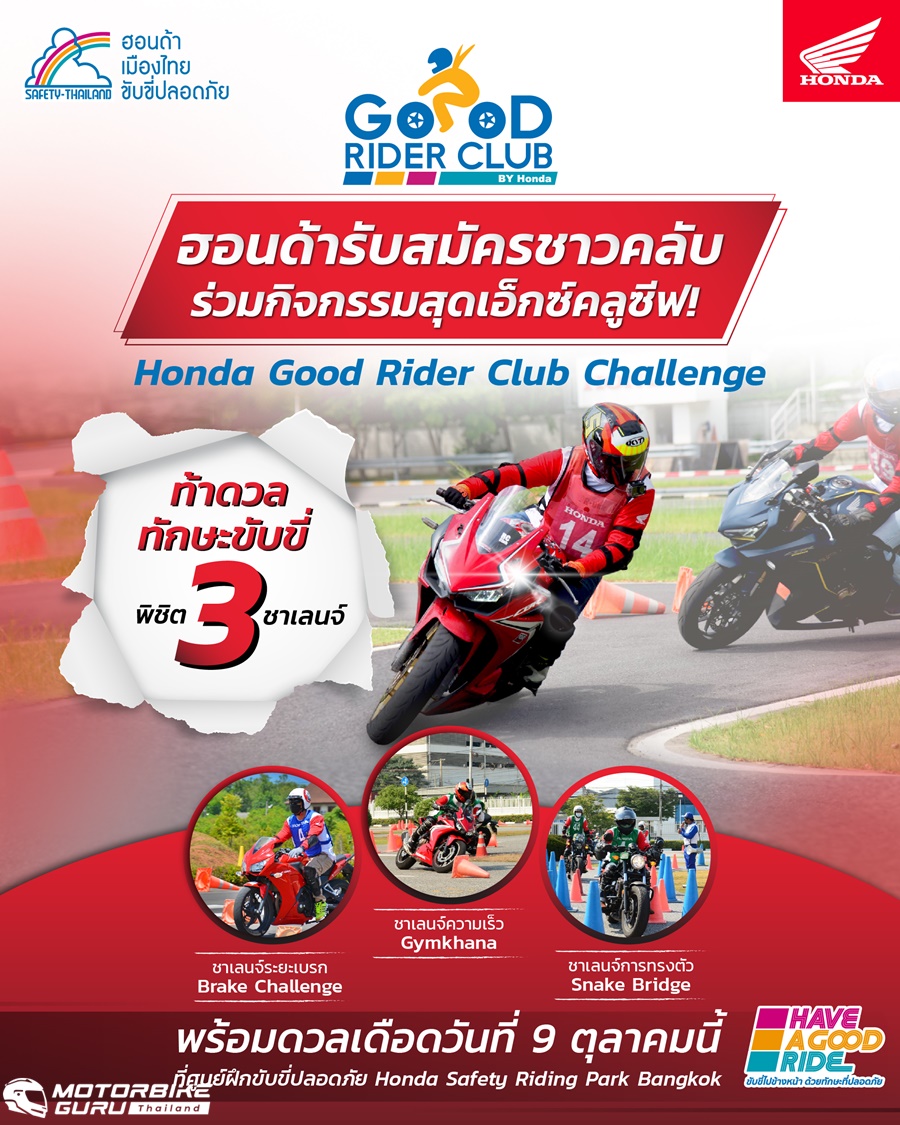 ฮอนด้าเชิญชวนสมาชิก Good Rider Club มาร่วมกิจกรรมสุดเอ็กซ์คลูซีฟ Honda Good Rider Club Challenge ดวลทักษะขับขี่ปลอดภัย หลักสูตร Master Instructor พิชิต 3 ชาเลนจ์สุดท้าทาย ได้แก่ Brake Challenge ทดสอบทักษะการใช้เบรกภายในระยะที่กำหนด, Gymkhana โชว์สกิลความคล่องตัว โดยใช้ความเร็วเป็นตัวตัดสิน และ Snake Bridge ดวลการทรงตัวในทางแคบ ใครขี่ช้าที่สุดเป็นผู้ชนะ