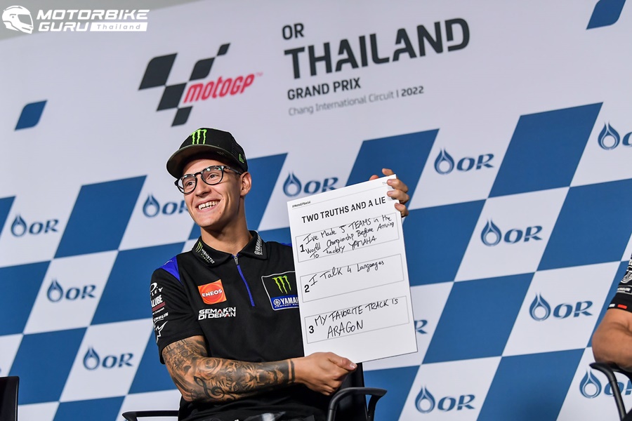 กวาร์ตาราโร จ่าฝูงบนตารางคะแนนสะสมกล่าวว่า “ผมไม่กังวลกับสภาพอากาศเลยครับ ไม่ว่าจะแทร็ก แห้ง หรือ เปียก ผมคิดว่าเราจะทำผลงานได้ดี มีเพียงเซ็คเตอร์ 1 และ 2 ที่ผมน่าจะมีปัญหา ผมมีความสุขมากที่เรากำลังจะได้ลงบิดที่ บุรีรัมย์ เป็นสนามต่อไป เพราะเป็นสนามที่ค่อนข้างดีกับผมและ ยามาฮ่า ด้วย ผมคว้าอันดับ 2 ใน ไทยแลนด์ กรังด์ปรีซ์ ครั้งที่แล้วเมื่อปี 2019 แน่นอนว่าผมจะทุ่มเทสุดความสามารถ เพื่อกลับไปยืนบนโพเดี้ยมให้ได้อีกครั้งในสนามนี้”