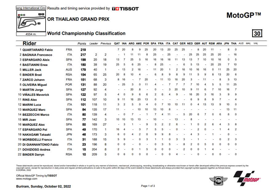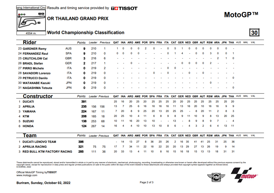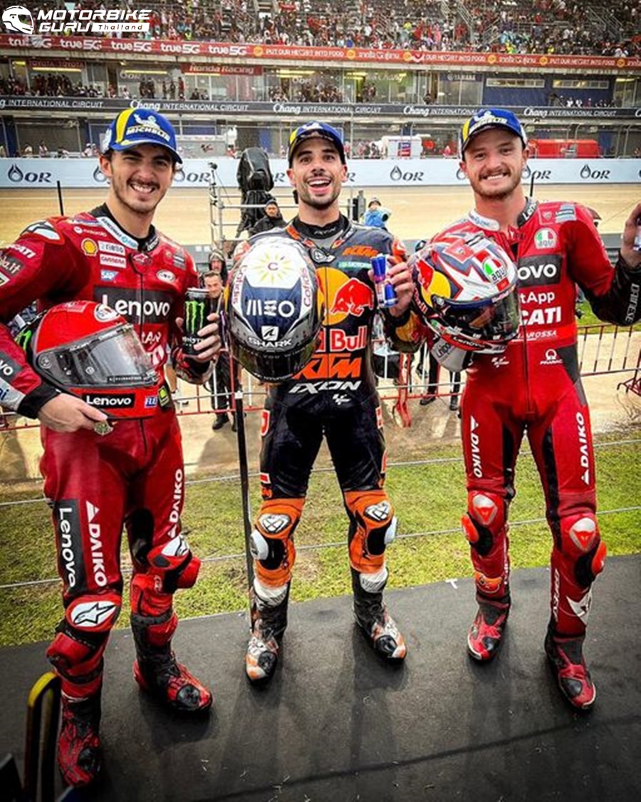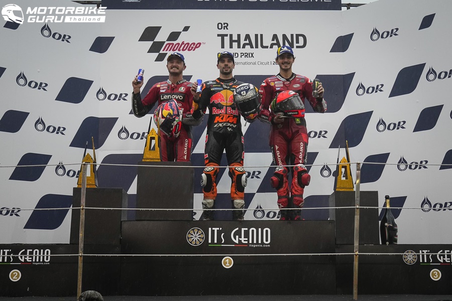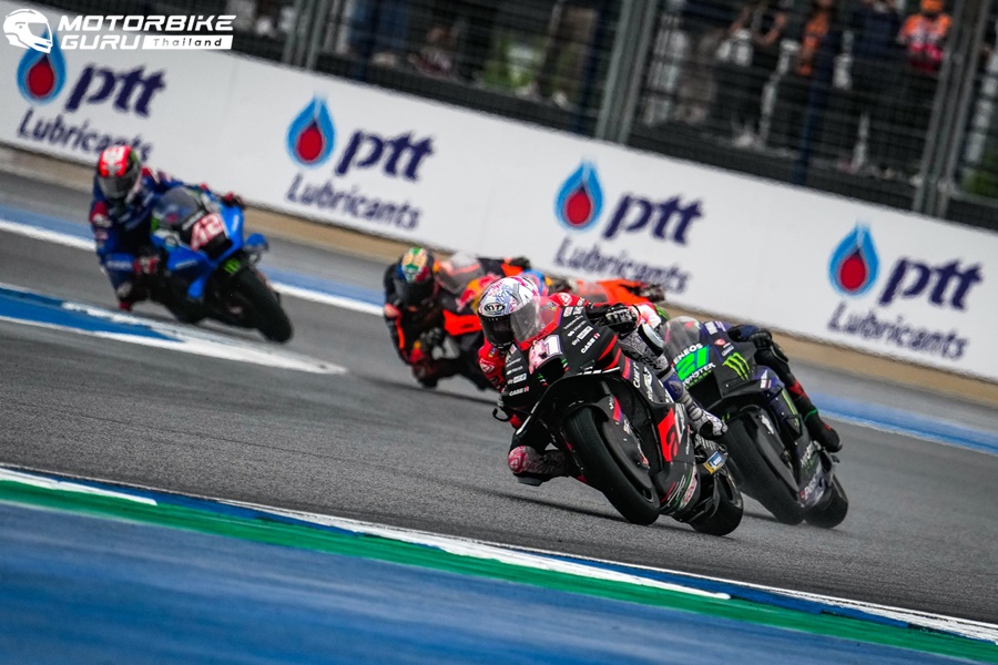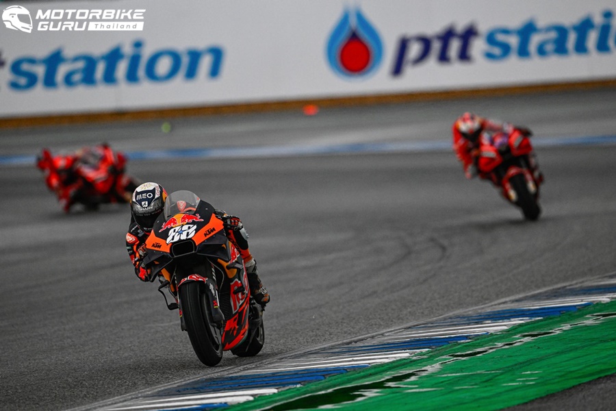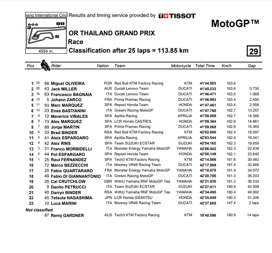 Miguel Oliveira จาก Red Bull KTM Factory Racing ฝ่าสายฝนคว้าชัยชนะเหมือนอย่างที่เขาเคยทำได้ในสนามที่อินโดนีเซีย โดยในรายการ OR Thailand Grand Prix คู่หูจาก Ducati Lenovo Team ก็คว้าอันดับ 2 และ 3 โดย Jack Miller ก็พยายามทุ่มสุดตัวเพื่อคว้าชัยชนะในการแข่ง โดยมี Francesco Bagnaia ตามมา ส่วนอันดับ 4 เป็นของ Johann Zarco จาก Prima Pramac Racing ที่แซงผ่าน Marc Marquez จาก Repsol Honda Team การจบการแข่งขันแบบนี้ดูจะเป็นข่าวดีสำหรับ Bagnaia เมื่อคะแนนสะสมตามหลัง Fabio Quartararo จาก Monster Energy Yamaha MotoGP เพียง 2 แต้ม เพราะในสนามนี้ Quartararo จบในอันดับที่ 17 ทำให้ไม่มีคะแนนสะสม ด้าน Aleix Espargaro จาก Aprilia Racing ก็ยังมีลุ้นเพราะคะแนนสะสม ห่างจากผู้นำเพียง 20 แต้ม