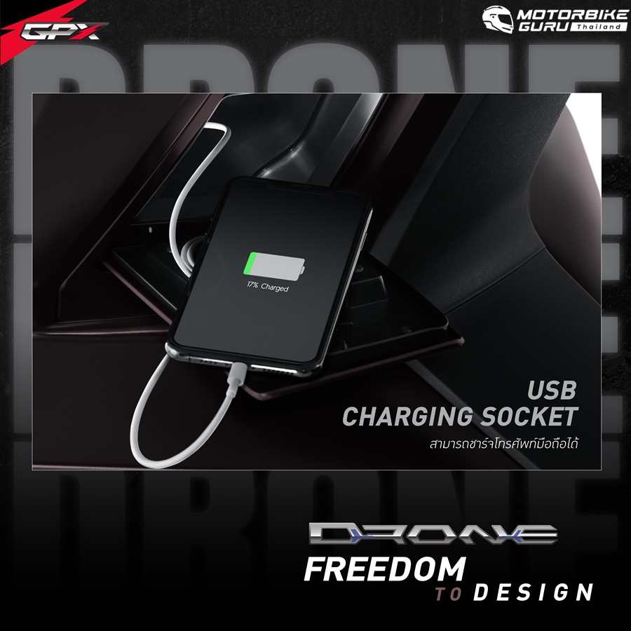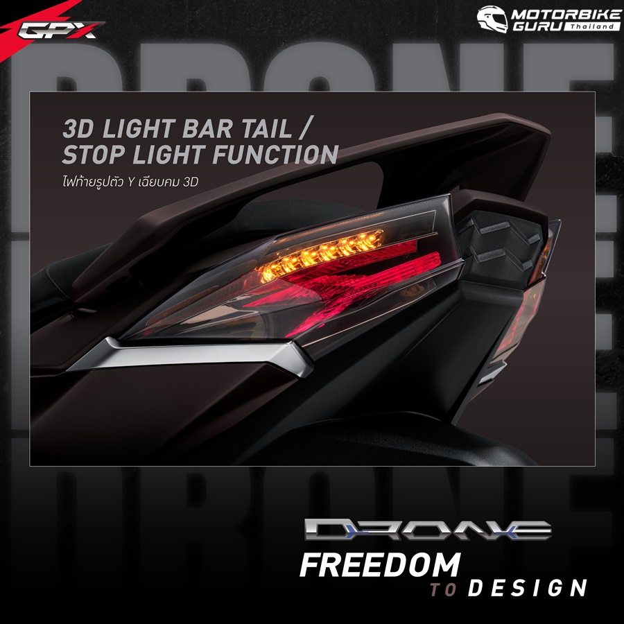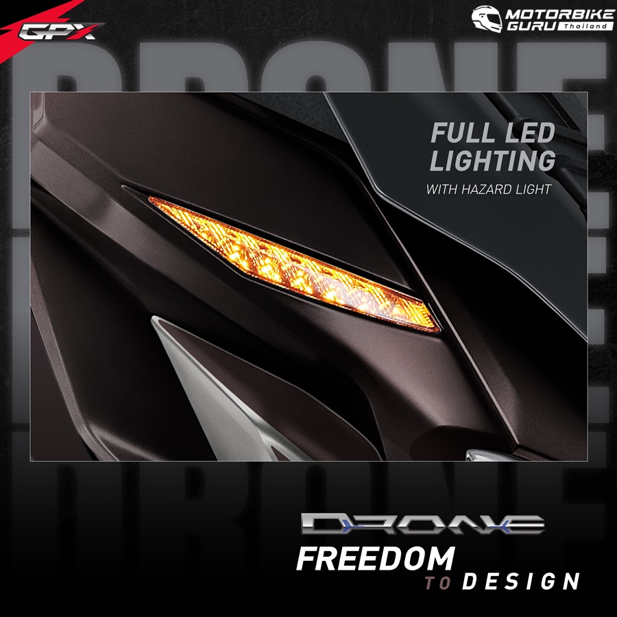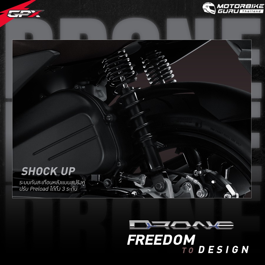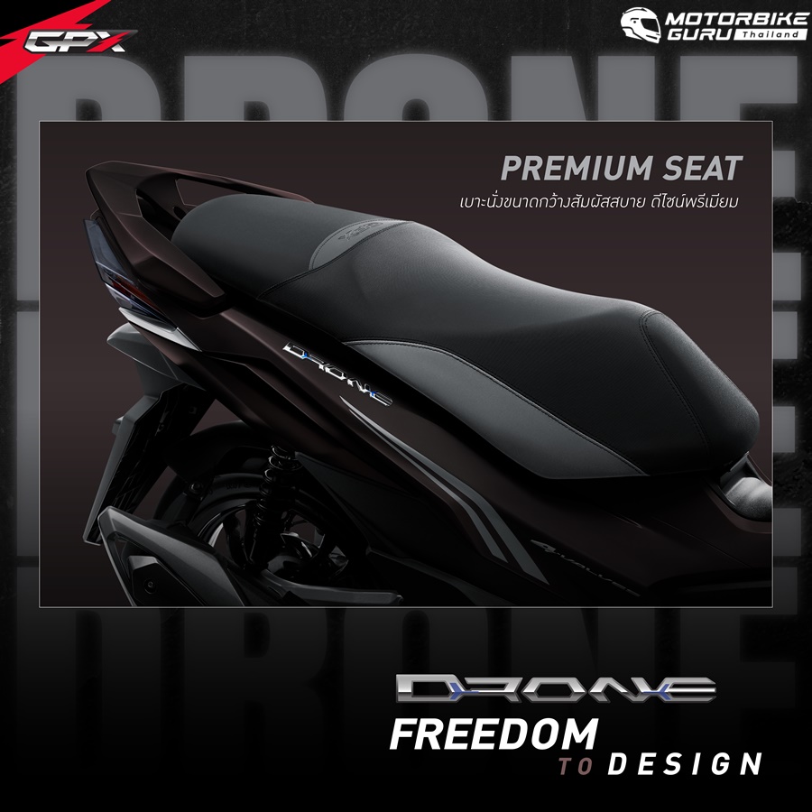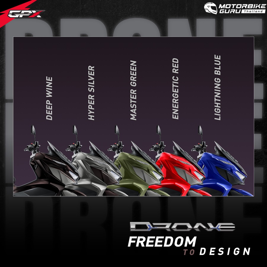 เผยโฉม! New GPX DRONE 150 (2023) สกู๊ตเตอร์พรีเมียม สปอร์ตดีไซน์ กับ 5 สีสันพิเศษในคอลเลคชั่นใหม่ ที่เปิดภาพให้ได้ยลโฉมกันเป็นที่เรียบร้อยแล้ว ผ่านช่องทางเฟสบุ๊คแฟนเพจ GPX Thailand กับการส่ง 5 เฉดสีพิเศษใหม่ ในคอนเซปต์ FREEDOM TO DESIGN ที่จะมาเพิ่มสีสัน ดีกรีความมันส์ เร้าใจ มากขึ้นกว่าเดิม!