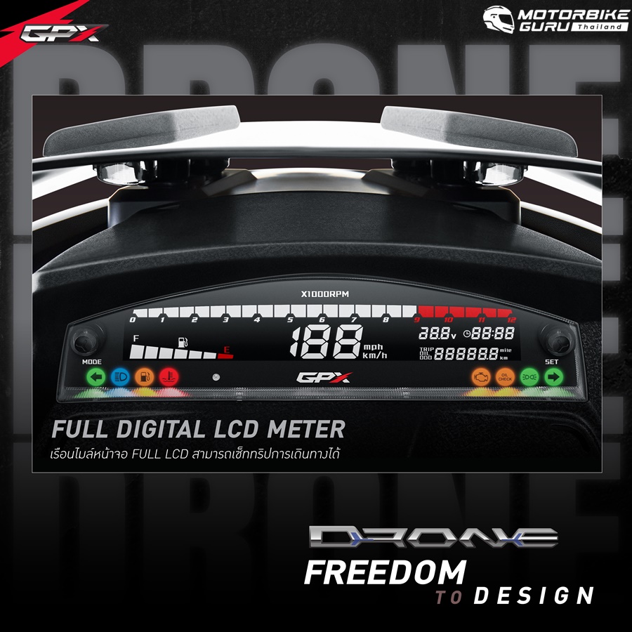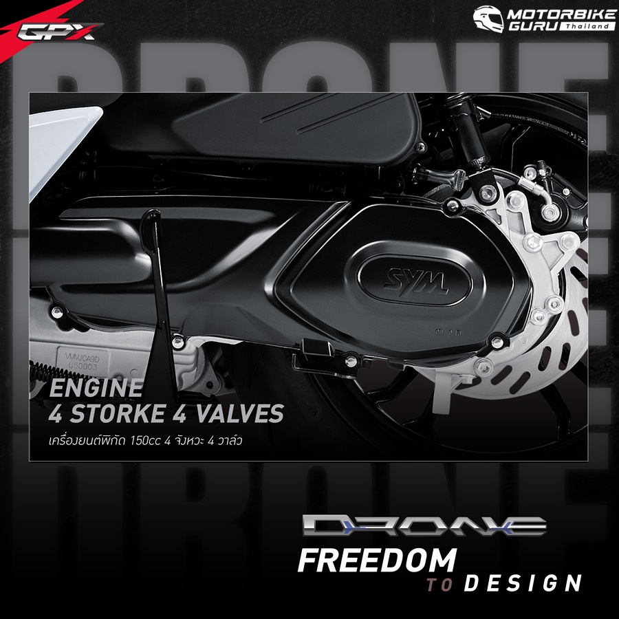 โดดเด่น ดุดัน บนงานดีไซน์ที่เฉียบคม จนทำให้ GPX DRONE 150 กลายมาเป็นโมเดลเรือธงของค่าย GPX กันเลยทีเดียว อีกทั้งในโมเดลนี้ยังมีความพิเศษ เพราะเป็นโมเดลที่ร่วมมือกับทาง SYM แบรนด์รถที่มีชื่อเสียงระดับโลก และมีความเชี่ยวชาญในวงการอุตสาหกรรมยานยนต์มาอย่างยาวนานกว่า 60 ปี การันตีด้วยเครือข่ายจัดจำหน่ายกว่า 90 ประเทศ ทั่วโลก จึงถือเป็นความร่วมมือครั้งสำคัญในแวดวงสองล้อเลยก็ว่าได้