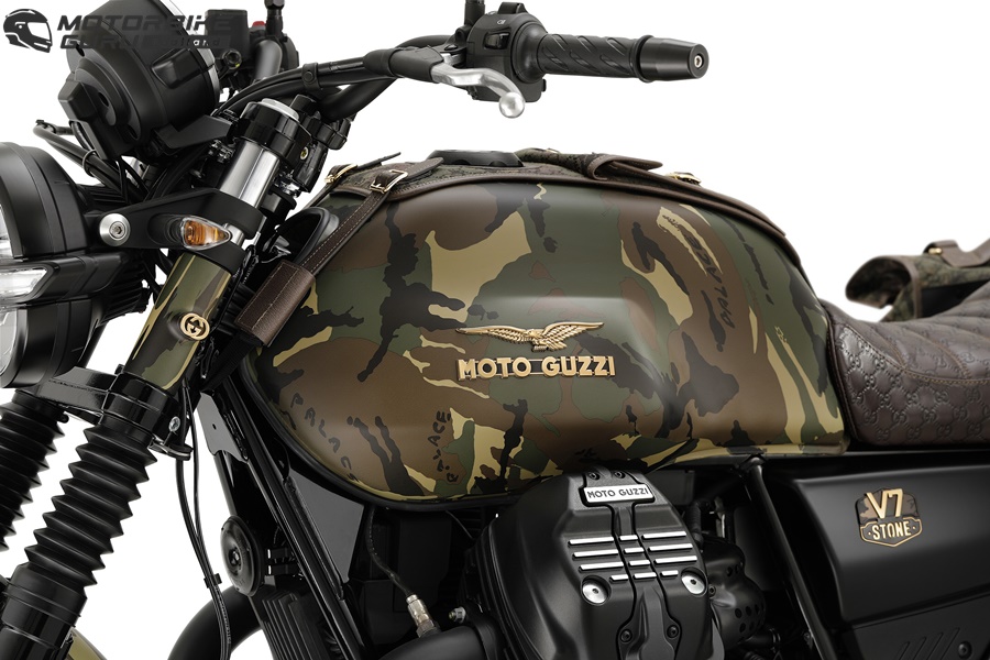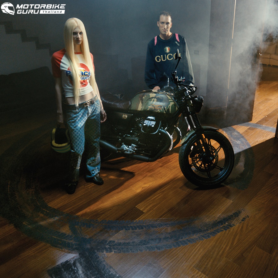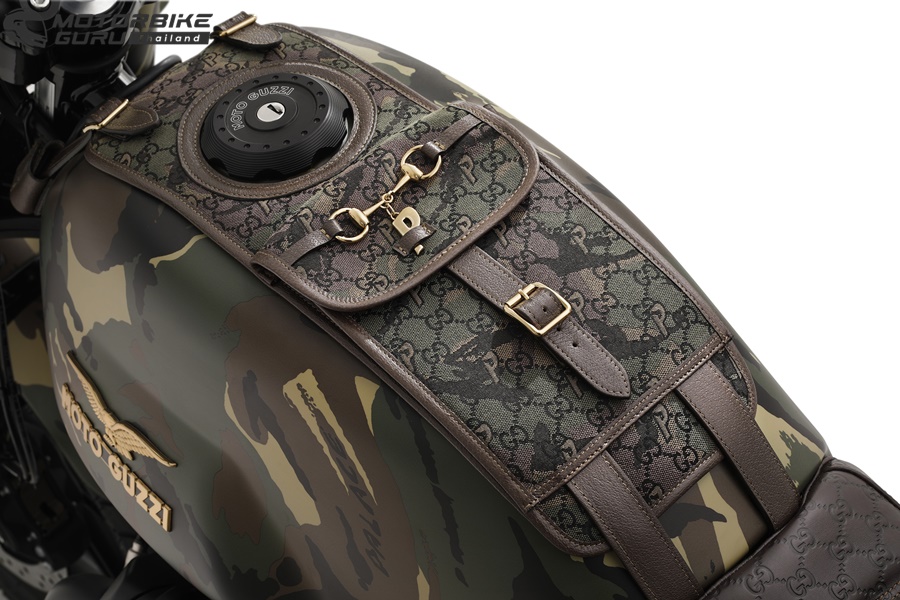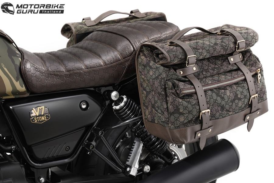 คอลแลบอเรชั่นที่น่าตื่นตานี้เริ่มต้นจากการสำรวจปรัชญาของแบรนด์ทั้ง 3 ที่มีร่วมกัน ก่อนจะค้นพบเส้นสาย สไตล์ และความเฉพาะตัวอันเกิดจากการผสมผสาน ซึ่งปรากฏอยู่ในทุกรายละเอียดของ Moto Guzzi V7 ไม่ว่าจะเป็นลายพรางบนตัวถังรถที่เป็นลายเซ็นของ Palace เบาะหนังสีน้ำตาลเข้มพร้อมลายโมโนแกรมอันคุ้นตาของ Gucci สอดรับกับลวดลายของกระเป๋าเก็บสัมภาระด้านหลังที่มีทั้งลายพรางของ Palace และโมโนแกรมของ Gucci ซ้อนเข้าด้วยกัน รวมถึงโลโก้นกอินทรีของ Moto Guzzi ที่โดดเด่นเป็นสง่ากลางตัวถัง