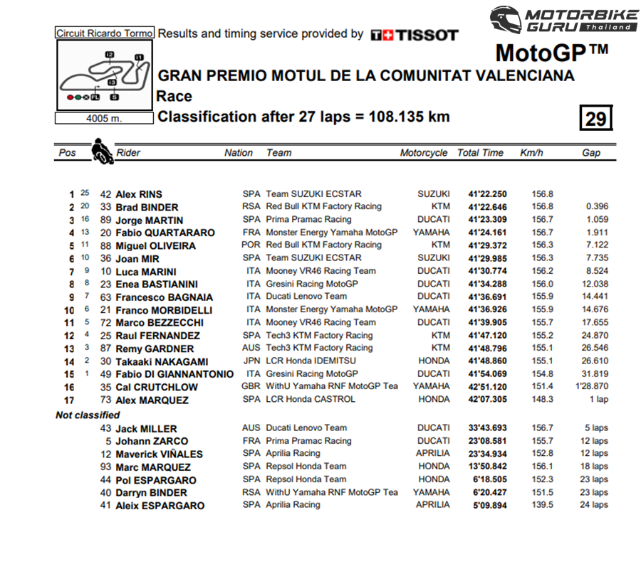 แต่ก็ไม่เพียงพอที่จะคว้าตำแหน่งแชมป์สมัยที่ 2 มาได้ แต่ที่น่าประทับใจที่สุดคือการนำม้วนเดียวจบของ Alex Rins จาก Team Suzuki Ecstar ซึ่งเป็นชัยชนะอีกครั้งและเป็นครั้งสุดท้ายใน MotoGP ของ Suzuki ซึ่งปีหน้าจะถอนทีมออกไป โดยมี Brad Binder จาก Red Bull KTM Factory Racing และ Jorge Martin จาก Prima Pramac Racing ร่วมโพเดี้ยมด้วยที่ Circuit Ricardo Tormo