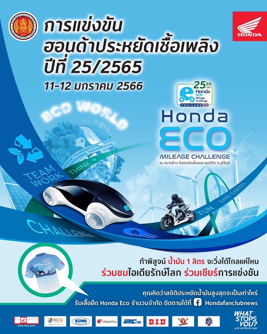 บริษัท ไทยฮอนด้า จำกัด ร่วมกับ สำนักงานคณะกรรมการการอาชีวศึกษา เดินหน้าจุดพลังฝันเยาวชนไทย จัดการแข่งขัน ฮอนด้าประหยัดเชื้อเพลิง Honda Eco Mileage Challenge ครั้งที่ 25 ประจำปี 2566 เปิดสังเวียนแข่งระดับโลกให้เด็กอาชีวศีกษาและอุดมศึกษา ร่วมโชว์ฝีมือออกแบบและประดิษฐ์ยานยนต์ประหยัดน้ำมันเชื้อเพลิงได้มากที่สุดเพื่อโลกอนาคต ภายใต้โจทย์ ท้าทายพลังความคิด ประดิษฐ์นวัตกรรมรักษ์โลก ท้าพิสูจน์น้ำมัน 1 ลิตร จะวิ่งได้ไกลแค่ไหน ในวันที่ 11-12 มกราคม 2566 ณ สนามช้าง อินเตอร์เนชั่นแนล เซอร์กิต จ.บุรีรัมย์