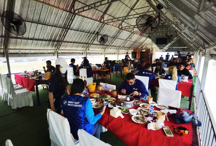 ก่อนจะมุ่งหน้าไปรับประทานอาหารกลางวันกันที่ร้านแพน้ำงึมซึ่งนอกเหนือไปจากการได้ทานอาหารกลางวันอย่างเอร็ดอร่อยแล้ว ยังได้เสพบรรยากาศพร้อมชมทัศนียภาพของแม่น้ำโขงอย่างเต็มอรรถรส เพราะทริปนี้บาจาจจัดให้ล่องแพทาน มื้อเที่ยงกันเลยทีเดียว