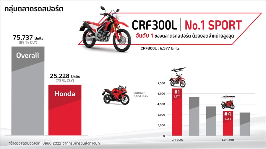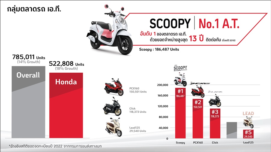ในปี 2022 นี้ รถจักรยานยนต์ฮอนด้าปิดตัวเลขที่ 1.38 ล้านคัน เติบโตขึ้น 12% เท่ากับตลาดรวม โดย 5 โมเดลแรกที่มียอดจำหน่ายสูงสุดยังคงเป็นฮอนด้า