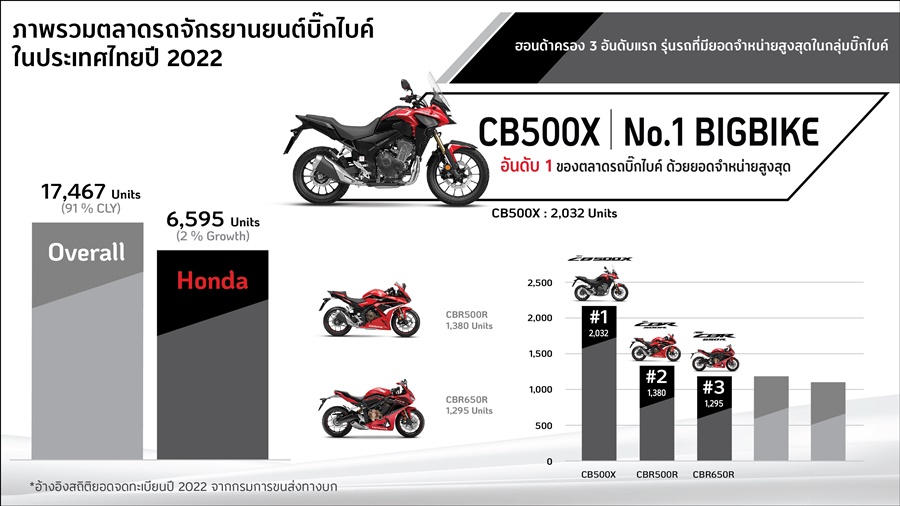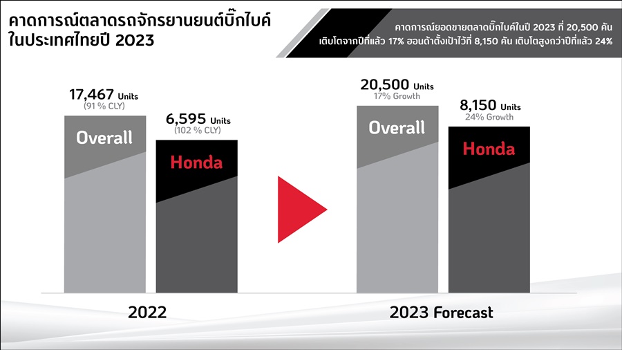 ในส่วนของตลาดรถบิ๊กไบค์ หรือรถจักรยานยนต์ขนาด 400cc ขึ้นไป ตลอดปี 2022 มียอดจดทะเบียนอยู่ที่ 17,467 คัน คิดเป็น 91% ของปีก่อนหน้า ในขณะที่ฮอนด้าทำยอดจำหน่ายได้ 6,598 คัน เติบโตขึ้น 2% และในปี 2023 นี้ คาดการณ์ว่าตลาดบิ๊กไบค์จะเติบโตขึ้นถึง 20,500 คัน หรือเพิ่มขึ้น 17% โดยปัจจัยสำคัญคือเทรนด์การเติบโตของรถในกลุ่ม Adventure ที่คนไทยหันมาให้ความสนใจกับกิจกรรมขับขี่ในสไตล์แอดแวนเจอร์ทัวริ่งมากขึ้นเรื่อยๆ โดยฮอนด้าตั้งเป้ายอดจำหน่ายไว้ที่ 8,150 คัน เพิ่มขึ้น 24%”