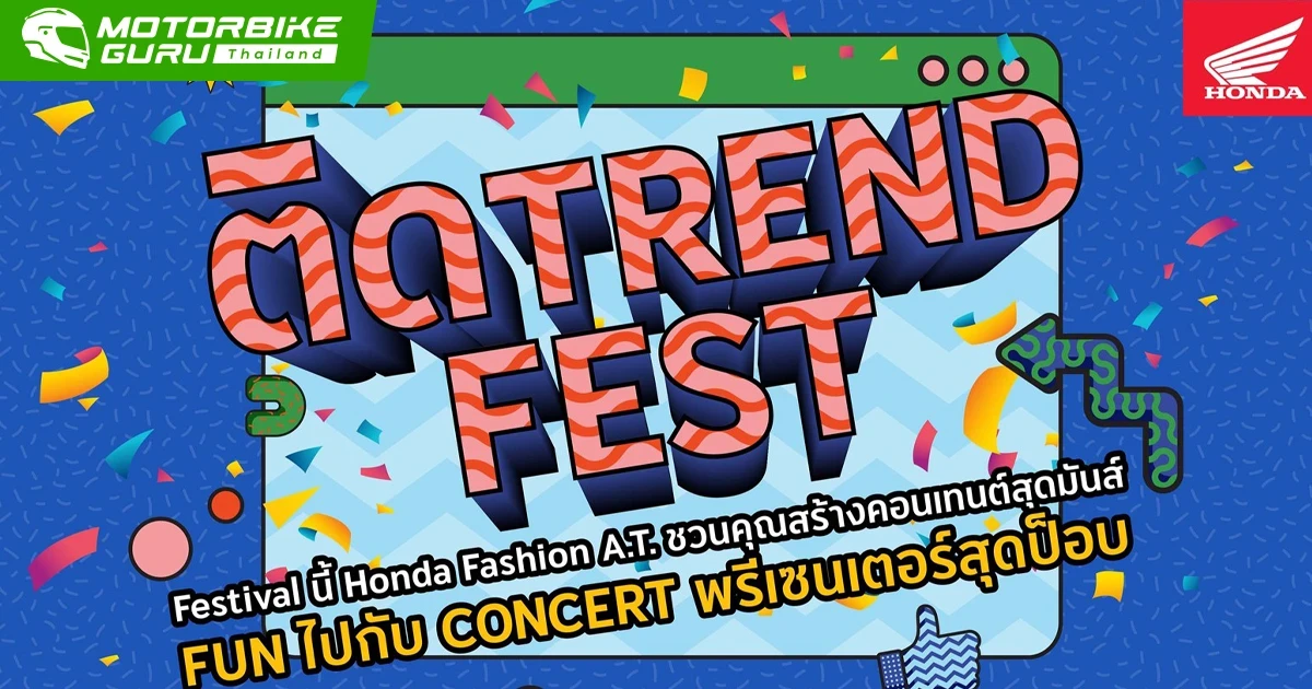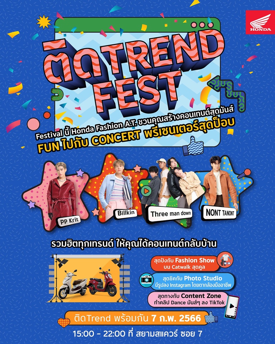 รถจักรยานยนต์ฮอนด้า ผู้นำเทรนด์ Fashion A.T. พร้อมระเบิดความสนุกครั้งใหญ่ให้วัยรุ่นได้มันส์กันไม่ยั้ง กับ “ติด Trend Fest” งานเฟสต์ครั้งสำคัญโดย Honda Scoopy และ Honda Lead ที่เปิดโอกาสให้วัยรุ่นได้มาอินเทรนด์กับกิจกรรมแบบติดเทรนด์ ไม่ว่าจะเป็น Content Zone Photo Zone พร้อมปลดปล่อยความสนุกไปกับคอนเสิร์ตจาก “พีพี x บิวกิ้น x นนท์ ธนท์ x Three man down” พรีเซนเตอร์รถจักรยานยนต์ฮอนด้า ที่จะมาโชว์สเต็ปสร้างเสียงกรี๊ดจากแฟนๆ พร้อมชมแฟชั่นโชว์คอลเลคชันพิเศษจากการคอลแลปของแบรนด์ดัง Color Cultures กับ Honda Scoopy และ Honda Lead พบกันวันที่ 7 กุมภาพันธ์นี้ ที่สยามสแควร์ซอย 7 ลานหน้าร้านอาหารสีฟ้า ตั้งแต่เวลา 15:00 น. เป็นต้นไป