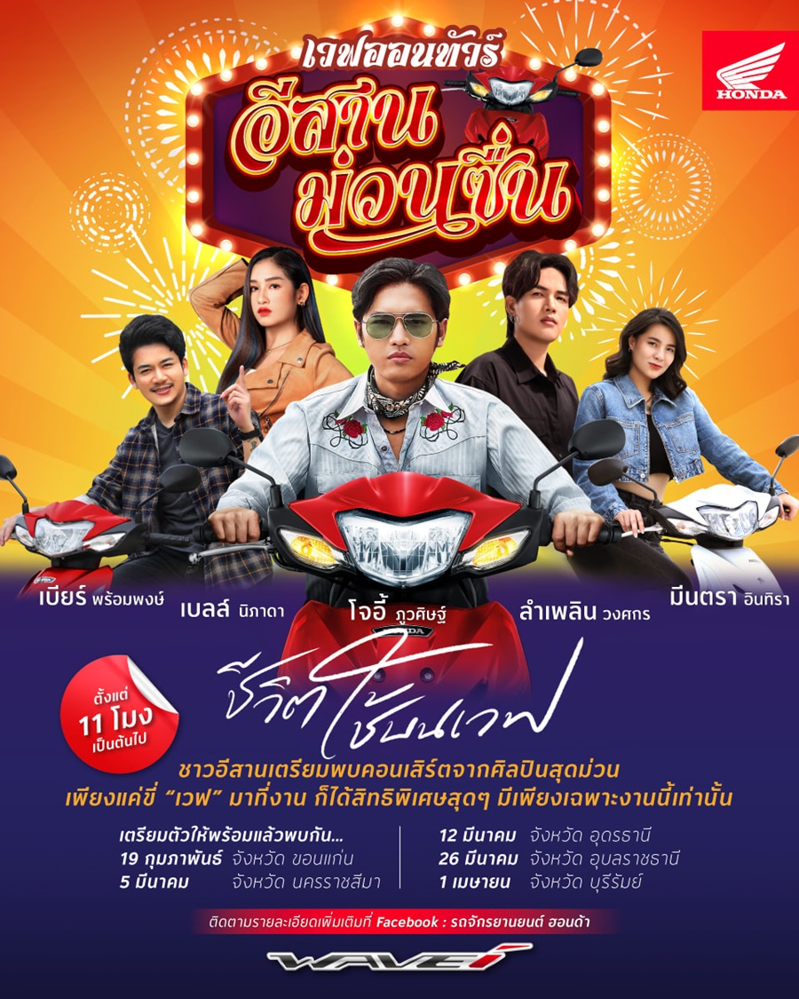 ไทยฮอนด้าพร้อมเปิดฉากความม่วนคักคักทั่วแดนอีสานกับงาน เวฟออนทัวร์ อีสานม่วนซื่น ที่จัดมาเพื่อครอบครัว Honda Wave รถจักรยานยนต์ฮอนด้ายอดนิยมอันดับหนึ่งของไทย กับหลากหลายกิจกรรม ไม่ว่าจะเป็นคอนเสิร์ตม่วนซื่นจากทัพศิลปินมาแรง และข้อเสนอพิเศษมากมาย ทั้งโปรโมชั่นพิเศษจองรถและเครื่องยนต์ฮอนด้าภายในงาน พร้อมแล้วที่จะไปเยือน 5 จังหวัด ทั่วแดนอีสาน ได้แก่ ขอนแก่น นครราชสีมา อุดรธานี อุบลราชธานี และบุรีรัมย์ เริ่มทัพความม่วนกันวันที่ 19 กุมภาพันธ์นี้ ที่บิ๊กซี สาขาบ้านแอนด์บียอนด์ จ. ขอนแก่น