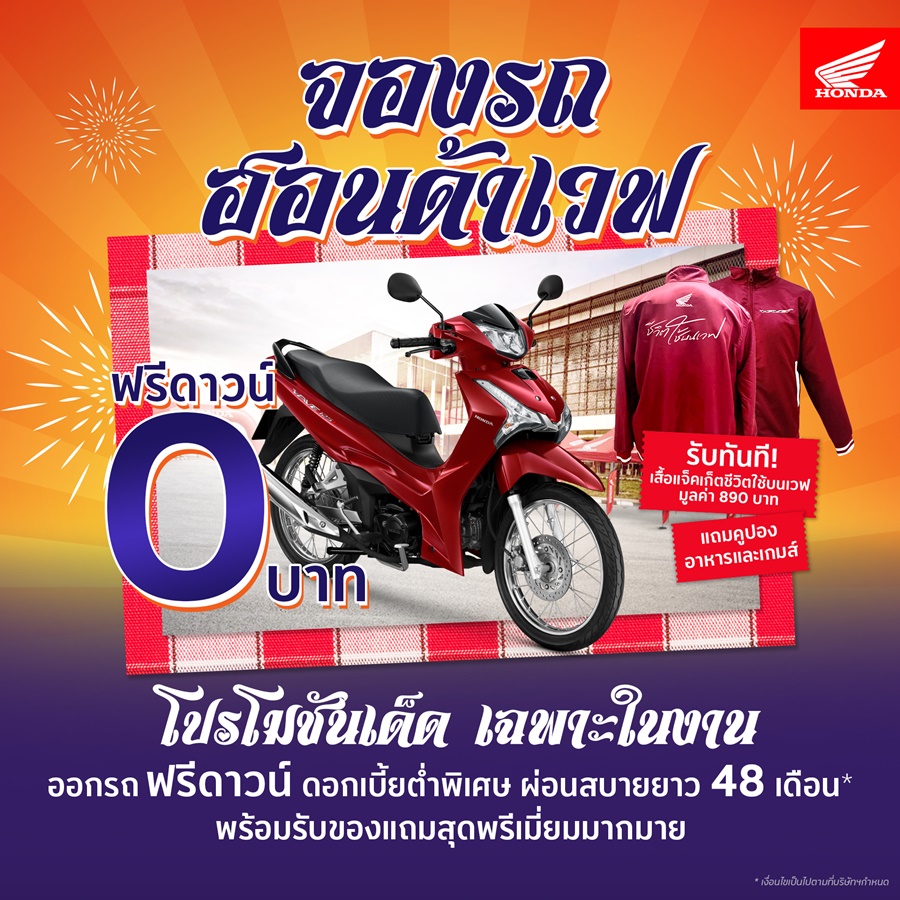 นอกจากนี้ ฮอนด้ายังพร้อมมอบข้อเสนอสุดพิเศษสำหรับผู้ที่สนใจ Honda Wave กับโปรโมชั่นฟรีดาวน์ ดอกเบี้ยพิเศษ ผ่อนยาว พร้อมของแถมสุดเอกซ์คลูซีฟ เสื้อ Jacket Honda Wave มูลค่า 890 บาท คูปองอาหารม่วนแซ่บ มูลค่า 125 บาท คูปองเกมส์ร่วมสนุกรับของรางวัลฟรี เฉพาะภายในงานเท่านั้น