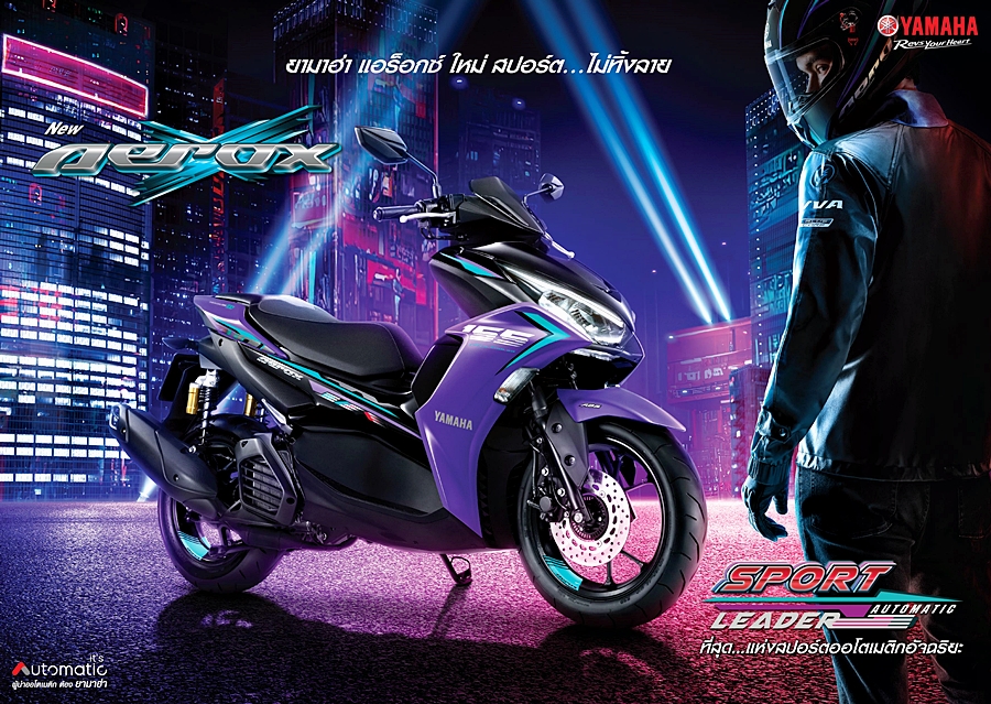 "ยามาฮ่า แอร็อกซ์ ใหม่" (Yamaha Aerox) SPORT AUTOMATIC LEADER สปอร์ต…อัจฉริยะ ที่สุดแห่งสปอร์ตออโตเมติก ตอบสนองการขับขี่ได้อย่างเร้าใจด้วยสมรรถนะแรงเหนือใคร ด้วยเครื่องยนต์บลูคอร์ 155 ซีซี พร้อมระบบวาล์วแปรผัน VVA ตอบสนองดีเยี่ยมทุกอัตราเร่ง สไตล์รถสปอร์ต ระบายความร้อนด้วยน้ำเต็มระบบ พร้อมลูกสูบแบบ Forged แข็งแกร่ง ทนทานและให้ความมั่นใจในการหยุดรถด้วยระบบเบรก ABS ป้องกันล้อล็อกขณะเบรกกะทันหัน ช่วยไม่ให้เสียการควบคุม