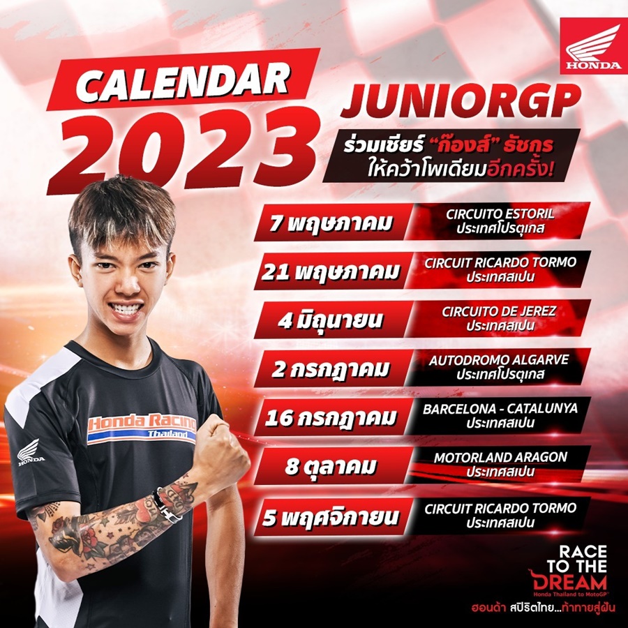 ก๊องส์-ธัชกร บัวศรี ยอดนักบิดดาวรุ่งชาวไทยจากโครงการ ฮอนด้า เรซ ทู เดอะ ดรีม เดินหน้าลุยศึกนักบิดดาวรุ่งระดับโลก เอฟไอเอ็ม จูเนียร์ จีพี เวิลด์ แชมเปี้ยนชิพ ภายใต้สังกัด ฮอนด้า เรซซิ่ง ไทยแลนด์ ด้วยรถหมายเลข 5 ตั้งเป้าเป้าล่าโพเดียมให้ได้ทุกสนาม และสร้างผลงานในรายการนี้ให้ดีกว่าเดิม หรืออย่างน้อยติดท็อป 5 ให้ได้ เพื่อขอบคุณทุกกำลังใจจากแฟนชาวไทย หลังเจ้าตัวเคยสร้างประวัติศาสตร์เป็นนักบิดไทยคนแรกที่คว้าชัยชนะมาครองได้จาก การประเดิมสนามในรายการนี้ ในปี 2022 นอกจากนั้น ตามที่ฮอนด้าได้แถลงแผนงานมอเตอร์สปอร์ตเมื่อต้นปีที่ผ่านมา ก๊องส์-ธัชกร จะคว้าสิทธิ์ไวลด์การ์ด 4 สนาม ในรายการโมโต 3 ซึ่งยังคงต้องรอการยืนยันว่าจะมีสนามไหนบ้าง แต่เป็นที่แน่นอนว่า 1 ใน 4 สนาม จะมีโฮมเรซ โออาร์ ไทยแลนด์ กรังด์ปรีซ์ 2023 ซึ่งจะจัดขึ้นช่วงปลายเดือนตุลาคมนี้ ที่สนามช้าง อินเตอร์เนชั่นแนล เซอร์กิต อย่างแน่นอน