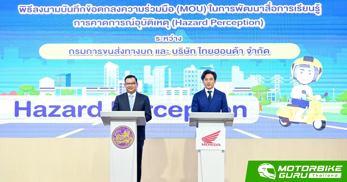 นายจิรุตม์ วิศาลจิตร อธิบดีกรมการขนส่งทางบก พร้อมด้วย มร.ชิเกโตะ คิมูระ ประธานกรรมการบริหาร บริษัท ไทยฮอนด้า จำกัด ร่วมพิธีลงนามบันทึกข้อตกลงความร่วมมือ (MOU) การพัฒนาสื่อการสอนเพื่อเรียนรู้และฝึกฝนการคาดการณ์อุบัติเหตุ (Hazard Perception) เพื่อเป้าหมายสู่การยกระดับความปลอดภัยและลดโอกาสการเกิดอุบัติเหตุบนท้องถนน โดยเตรียมเพิ่มเนื้อหาการคาดการณ์เป็นหนึ่งในกระบวนการอบรมให้ความรู้กับผู้ที่จะขอรับและขอต่ออายุใบอนุญาตขับขี่รถจักรยานยนต์ ภายในเดือนมิถุนายน พ.ศ.2566 นี้