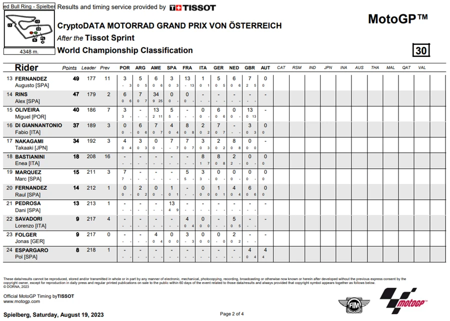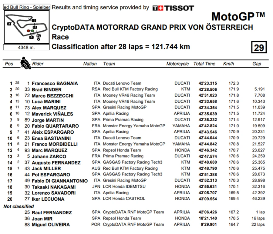 แต่ท้ายที่สุดการแข่งขันรายการ CryptoDATA Motorrad Grand Prix von Österreich ก็จบลงด้วยชัยชนะของ Bagnaia ส่วน Binder จบด้วยอันดับที่ 2 ส่วนอันดับที่ 3 เป็นของ Bezzecchi ส่วนการแข่งขันในสนามถัดไปเป็นรายการ Gran Premi Monster Energy de Catalunya ที่สนาม Circuit de Barcelona-Catalunya ในสเปน ในวันที่ 1-3 กันยายน นี้