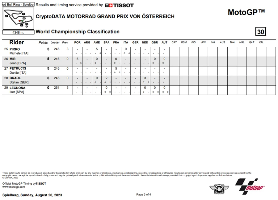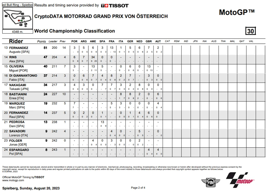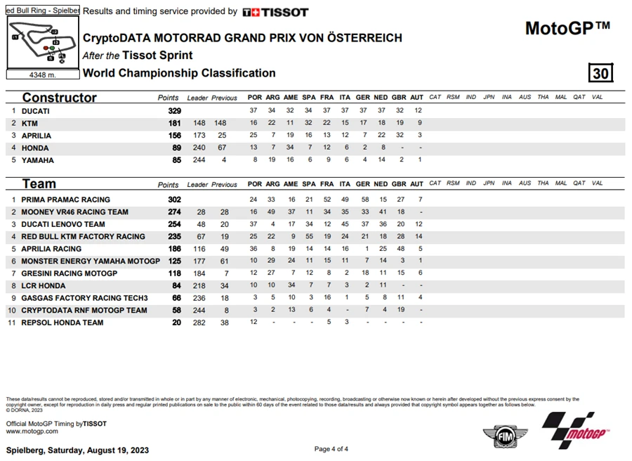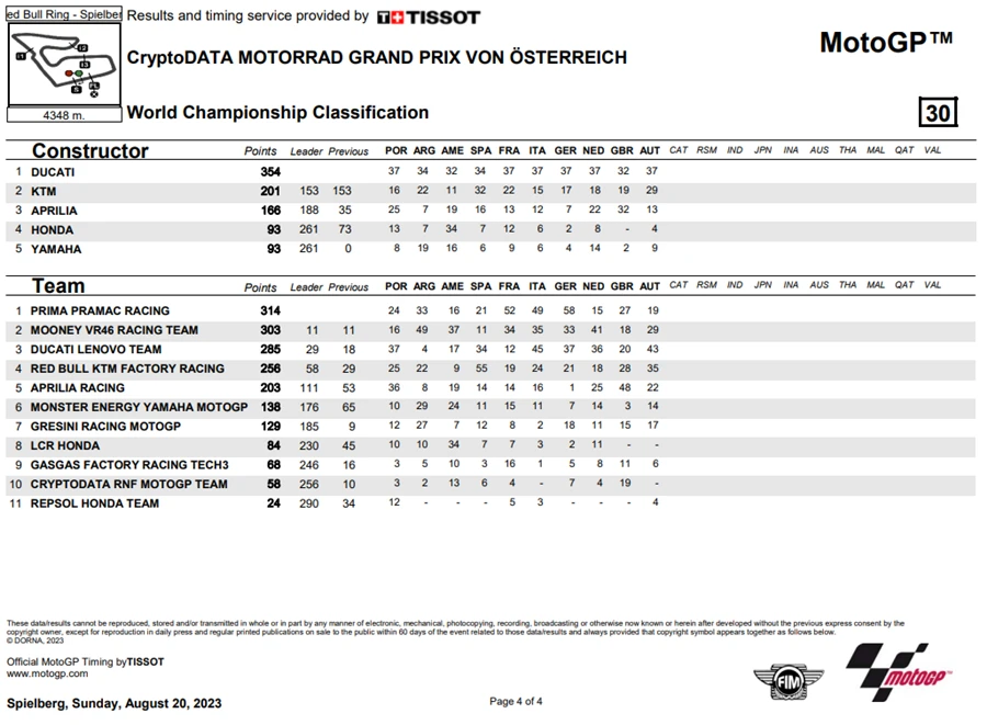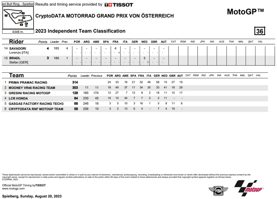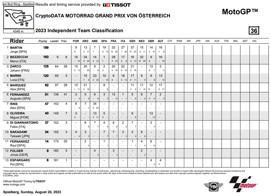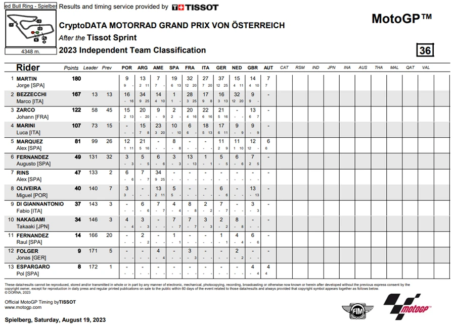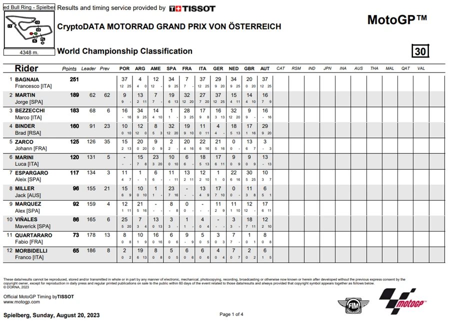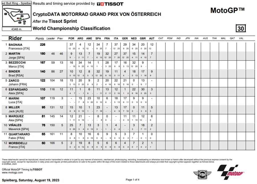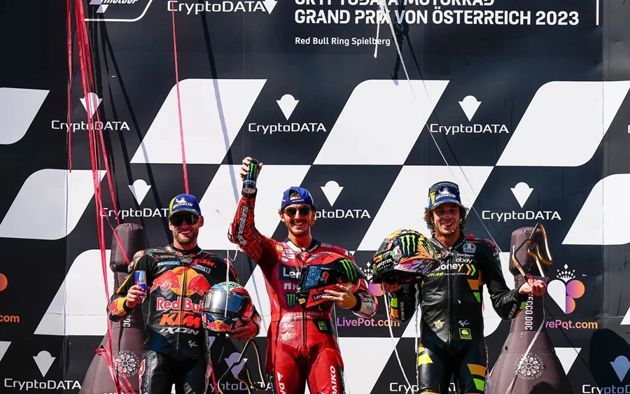 การแข่งขัน MotoGP สนามที่ 10 ของฤดูกาล 2023 ในรายการ CryptoDATA Motorrad Grand Prix von Österreich ที่ Red Bull Ring ประเทศออสเตรีย ดูเหมือนจะไม่มีใครหยุดความร้อนแรงของ Francesco Bagnaia จาก Ducati Lenovo Team ได้หลังเจ้าตัวคว้า โพลโพซิชั่น, เอาชนะ Sprint Race และท้ายที่สุดยังเอาชนะได้ในเรซหลัก คว้าคะแนนสะสมทิ้งห่าง Jorge Martin จาก Prima Pramac Racing ไปถึง 62 แต้ม