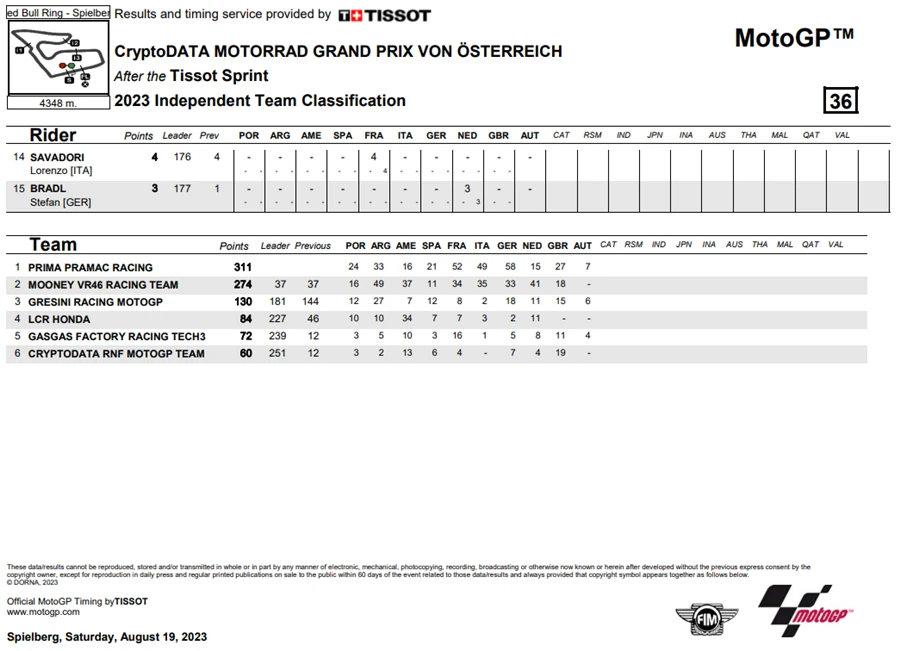 การแข่งขัน CryptoDATA Motorrad Grand Prix von Österreich เริ่มต้นขึ้นด้วย Tissot Sprint Race โดย Bagnaia ที่สามารถคว้าโพลไปได้ หลังจากการออกสตาร์เริ่มขึ้นก็ยังออกตัวได้ดีเช่นเคย ส่วน Maverick Viñales จาก Aprilia Racing ที่ออกสตาร์ทจากอันดับที่ 2 กลับออกตัวได้อย่างน่าตกใจ นี่ยังคงเป็นเป็นปัญหาของ Viñales