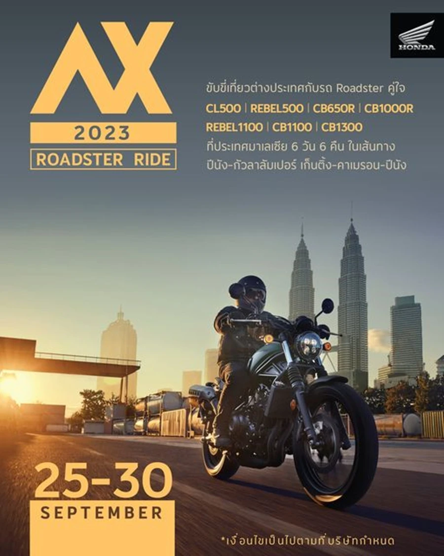 ฮอนด้าบิ๊กไบค์ ชวนไบเกอร์ร่วมกิจกรรม Asian Xperience 2023 Roadster Ride ขับขี่รถท่องเที่ยวในต่างแดน เปิดประสบการณ์ไปกับรถ Roadster คู่ใจ ตลอดระยะเวลา 6 วัน 6 คืน เริ่มจากจุดสตาร์ตที่หาดใหญ่ จังหวัดสงขลา ประเทศไทย มุ่งหน้าสู่ปีนัง ประเทศมาเลเซีย ตั้งแต่วันที่ 25-30 กันยายน 2566