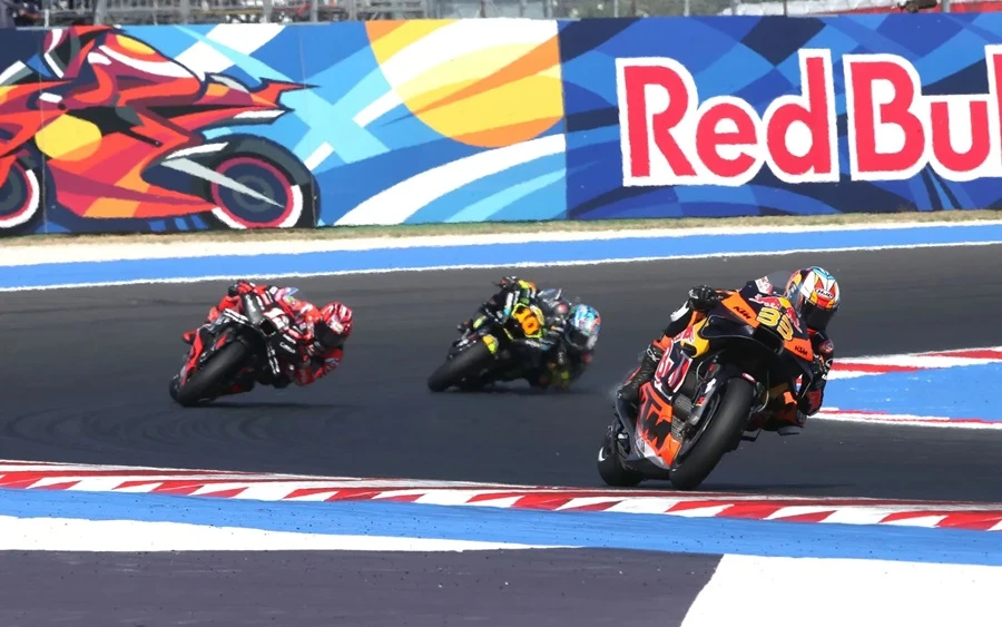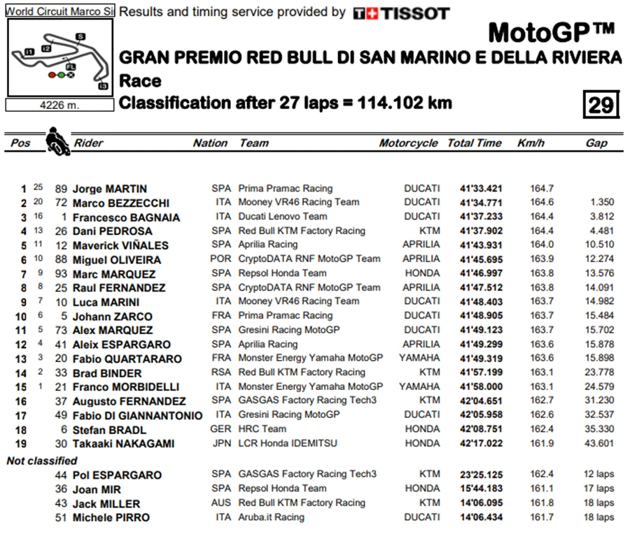 ถัดมาในช่วงเรซการแข่งขันหลักของ #SanMarinoGP ก็ยังเป็น Martin ที่ออกตัวได้ดีและยังคงคว้าโฮลช็อตได้อีกครั้ง ปล่อยให้ Bezzecchi, Bagnaia และ Pedrosa ตามมาเหมือนเคย จากนั้น Bagnaia ที่ต่อสู้กับอาการบาดเจ็บก็แซงผ่าน Bezzecchi เพื่อเริ่มไลล่าอันดับ 1 จาก Martin ส่วน 2 นักแข่งจาก Red Bull KTM Factory อย่าง Binder และ Jack Miller ก็ดูจะไม่สามารถทำได้ดีเท่า Pedrosa ได้ในสนามนี้ โดยเฉพาะ Miller ที่พลาดล้มจนต้องออกจากการแข่งขันไปจากเหตุการณ์กับปะทะกับ Michele Pirro จาก Ducati Lenovo Team ที่มาขี่แทน Enea Bastianini