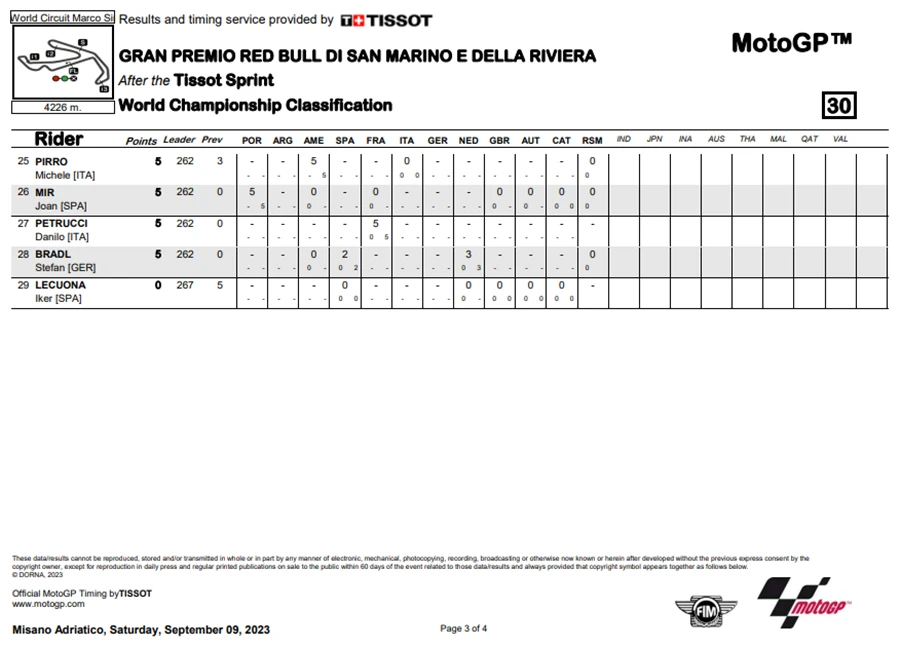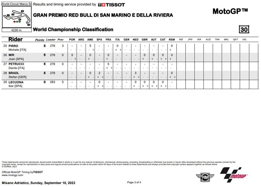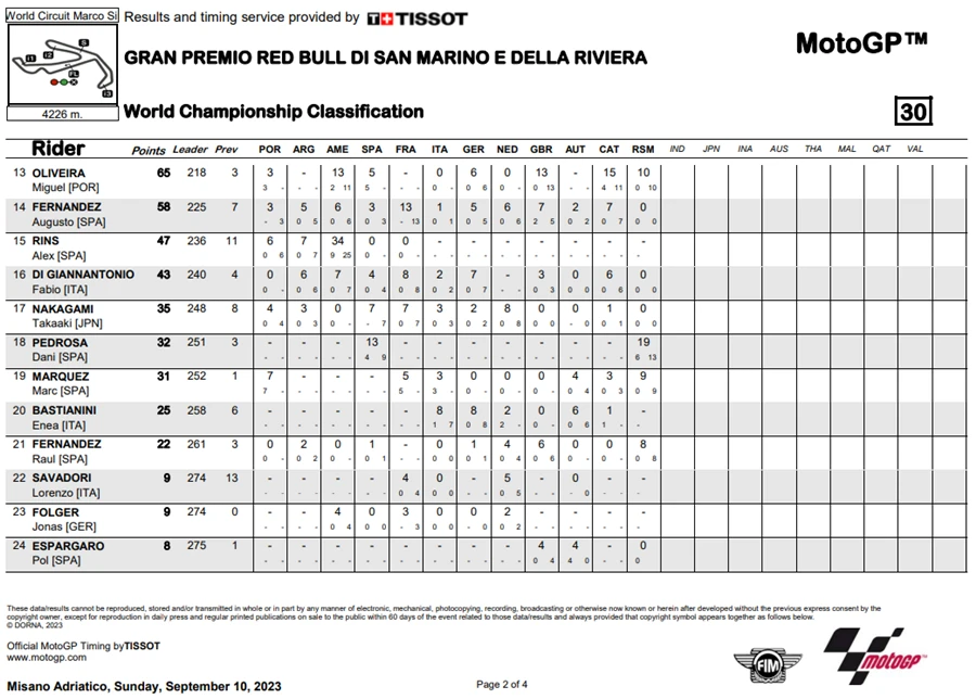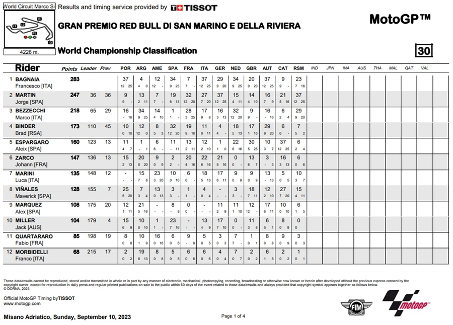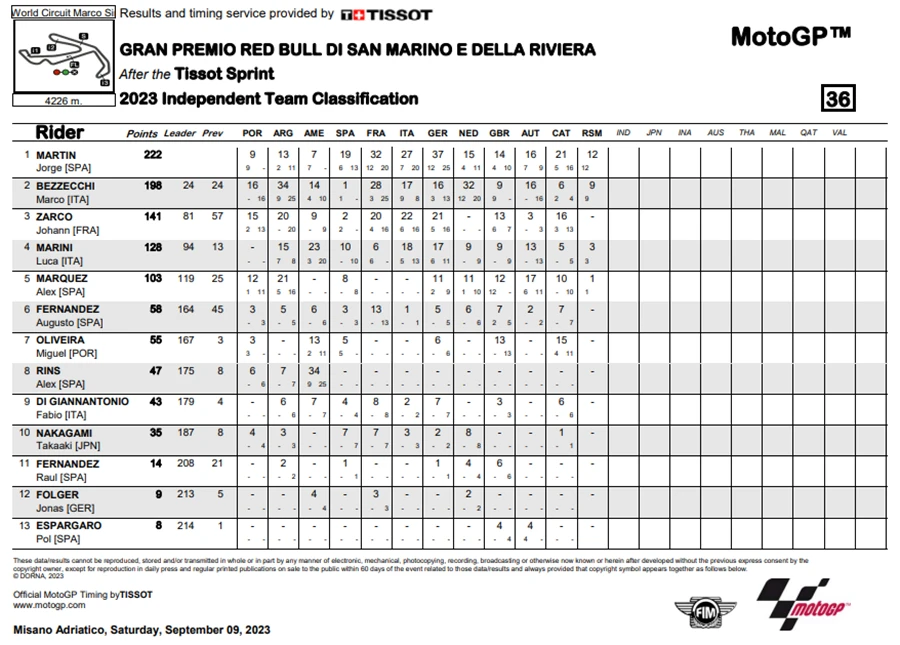 การแข่งขันในสนามที่ 12 ของ MotoGP 2023 ในรายการ Gran Premio Red Bull di San Marino e della Riviera di Rimini ที่สนาม Misano World Circuit Marco Simoncelli หรือ #SanMarinoGP โดยชัยชนะตกเป็นของ Jorge Martin ที่คว้าชัยให้ Prima Pramac Racing ได้ทั้ง 2 รอบการแข่งขัน ส่วน Marco Bezzecchi จาก Mooney VR46 Racing Team ก็สามารถจบด้วยอันดับที่ 2 ด้าน Francesco Bagnaia จาก Ducati Lenovo Team ที่พลาดล้มแล้วโดนรถทับขาในสนามที่แล้วก็ฝืนอาการบาดเจ็บลงทำการแข่งขันจนได้อันดับที่ 3 มาครอง
