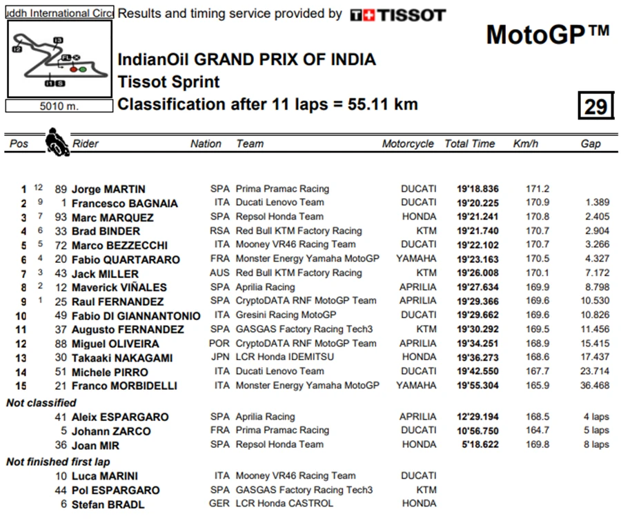 ถึงแม้ Bezzecchi จะเสียจังหวะไปในโค้งที่ 1 แต่ก็พยายามกลับเข้าสู่เกมการแข่งขัน โดยพยายามไล่ล่าอันดับที่ดีที่สุด ในขณะที่ใกล้จบรอบการแข่งขัน ก็ขึ้นสู่อันดับ 5 ได้สำเร็จทั้งยังทำ Fastest Lap ได้ในรอบสุดท้าย ซึ่งเอาชนะสถิติดีที่สุดก่อนหน้านี้ของเจ้าตัวเองด้วย จบการแข่งขันรอบ Sprint Race ด้วยชัยชนะของ Martin นักบิดชาวสเปนที่สามารถเอาชนะ Bagnaia ได้อีกครั้งและเป็นครั้งแรกบนแผ่นดินอินเดีย ทำให้เป็นชัยชนะ 3 ครั้ง ติดต่อกันของ Martin (Sprint Race 2 ครั้งและ GP 1 รายการ) ด้าน Bagnaia ก็จบด้วยอันดับ 2 แต่ที่น่าตื่นเต้นก็คือ M.Marquez ที่จบในอันดับที่ 3 เป็นการกลับมาอย่างน่ายินดีสำหรับแฟน ๆ Honda