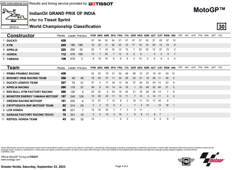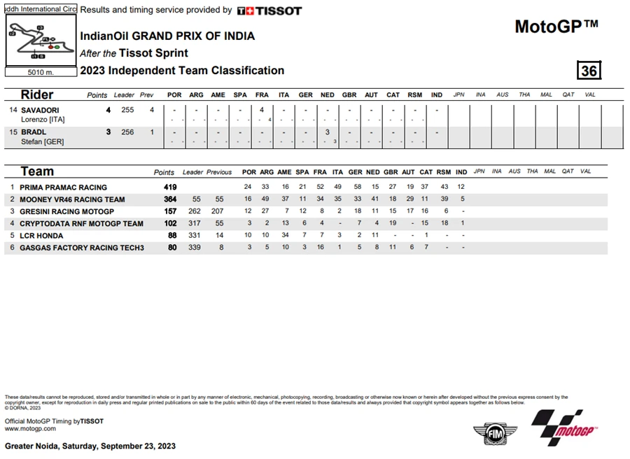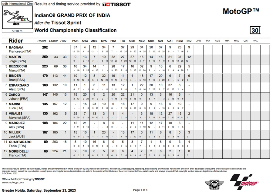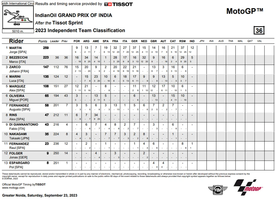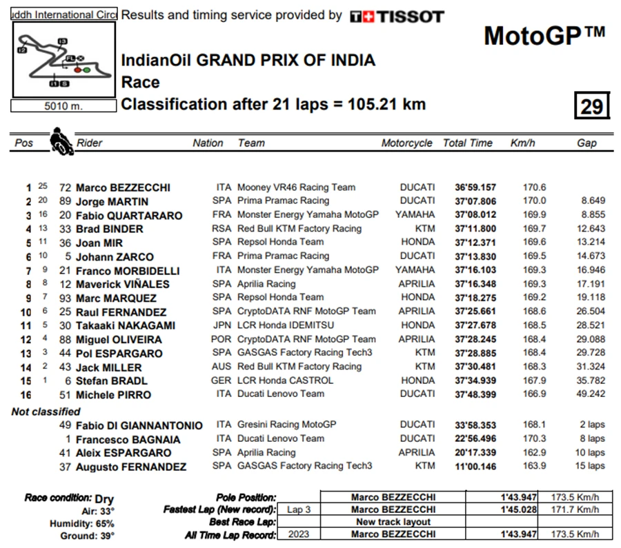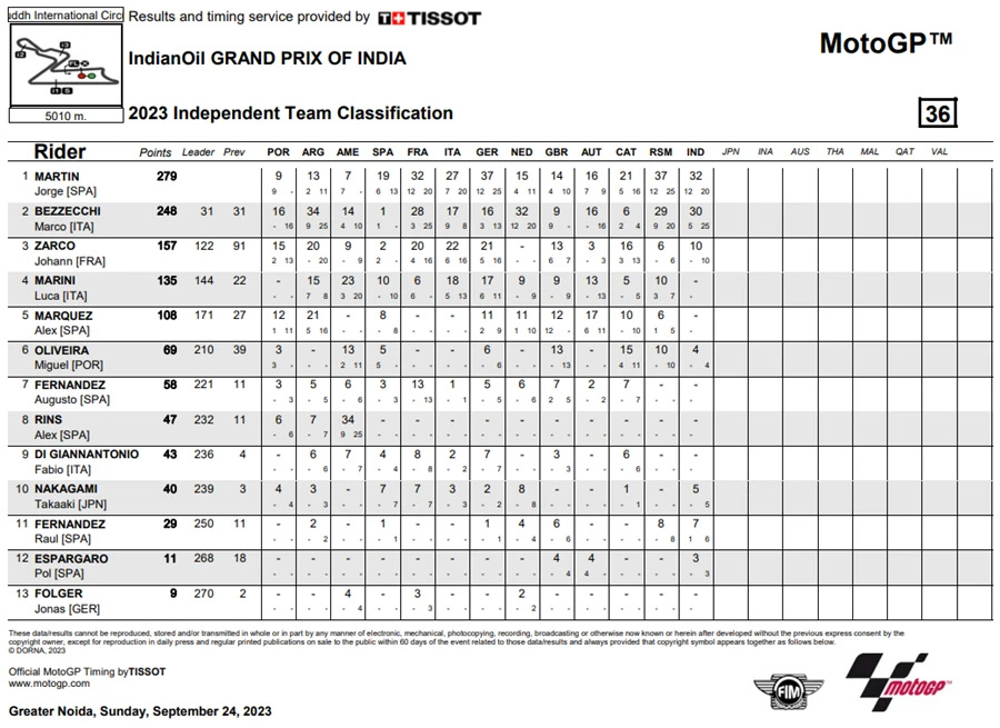 การแข่งขันในสนามที่ 13 ของ MotoGP 2023 ในรายการ IndianOil Gran Prix of India ที่สนาม Buddh International Circuit หรือ #IndianGP นับเป็นสนามที่ท้าทายความสามารถนักแข่งทุกคน รวมถึงทีมช่างในการหาเซ็ตติ้ง เพราะไม่เคยรองรับการแข่งขัน MotoGP มาก่อน โดยมีระยะทางต่อรอบ 5.01 กิโลเมตร มีทั้งสิ้น 13 โค้ง ขวา 8 ซ้าย 5 ทางตรงยาวที่สุด 1.006 กิโลเมตร มีโซนเบรกหนักหลายจุด และต้องใช้ความแข็งแกร่งร่างกายสูงมาก โดยชัยชนะตกเป็นของ Marco Bezzecchi จาก จาก Mooney VR46 Racing Team ที่สามารถเอาชนะ Jorge Martin จาก Primac Pramac Racing โดยทิ้งห่างไปด้วยเวลา 8.649 วินาที และที่ 3 กลายเป็น Fabio Quartararo จาก Monster Energy Yamaha MotoGP ที่กลับมาขึ้นโพเดี้ยมได้อีกครั้งหลังจากห่างหายไปนาน แต่ที่น่าเสียดสยที่สุดกลับเป็น Francesco Bagnaia จาก Ducati Lenovo Team ที่พลาดล้มจนออกจากการแข่งขันไป ทำให้คะแนนสะสมที่นำห่างอย่างปลอดภัยก่อนการแข่งขันกลับมานำอยู่เพียง 13 แต้มเท่านั้น