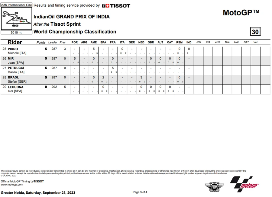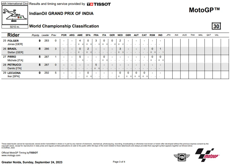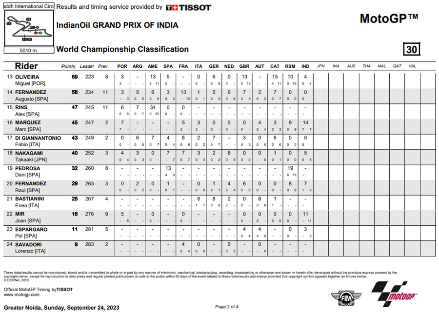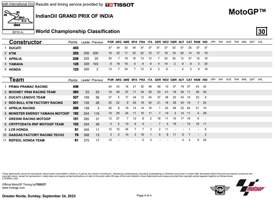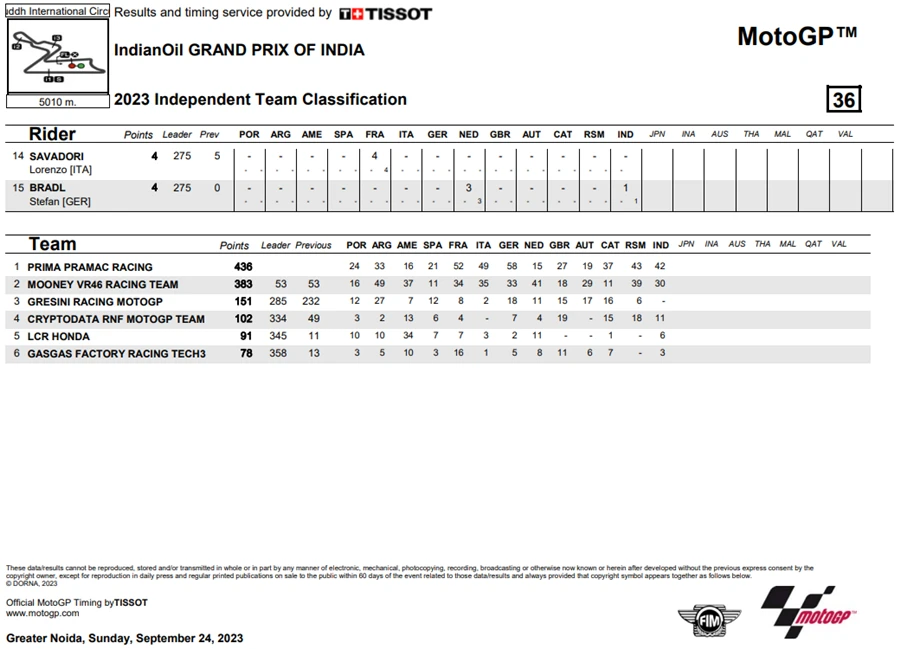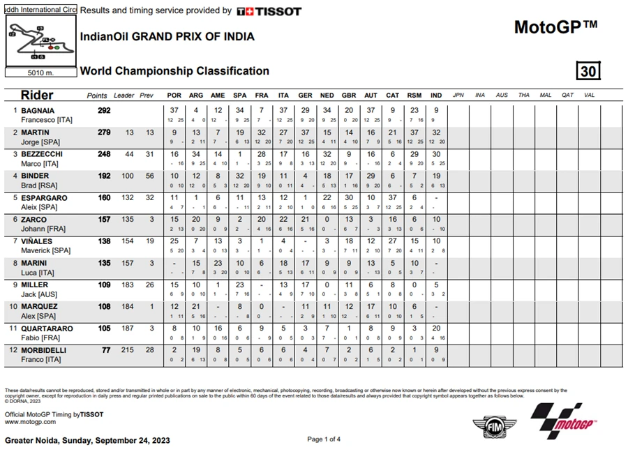 การแข่งขันในสนามที่ 13 ของ MotoGP 2023 ในรายการ IndianOil Gran Prix of India ที่สนาม Buddh International Circuit หรือ #IndianGP นับเป็นสนามที่ท้าทายความสามารถนักแข่งทุกคน รวมถึงทีมช่างในการหาเซ็ตติ้ง เพราะไม่เคยรองรับการแข่งขัน MotoGP มาก่อน โดยมีระยะทางต่อรอบ 5.01 กิโลเมตร มีทั้งสิ้น 13 โค้ง ขวา 8 ซ้าย 5 ทางตรงยาวที่สุด 1.006 กิโลเมตร มีโซนเบรกหนักหลายจุด และต้องใช้ความแข็งแกร่งร่างกายสูงมาก โดยชัยชนะตกเป็นของ Marco Bezzecchi จาก จาก Mooney VR46 Racing Team ที่สามารถเอาชนะ Jorge Martin จาก Primac Pramac Racing โดยทิ้งห่างไปด้วยเวลา 8.649 วินาที และที่ 3 กลายเป็น Fabio Quartararo จาก Monster Energy Yamaha MotoGP ที่กลับมาขึ้นโพเดี้ยมได้อีกครั้งหลังจากห่างหายไปนาน แต่ที่น่าเสียดสยที่สุดกลับเป็น Francesco Bagnaia จาก Ducati Lenovo Team ที่พลาดล้มจนออกจากการแข่งขันไป ทำให้คะแนนสะสมที่นำห่างอย่างปลอดภัยก่อนการแข่งขันกลับมานำอยู่เพียง 13 แต้มเท่านั้น
