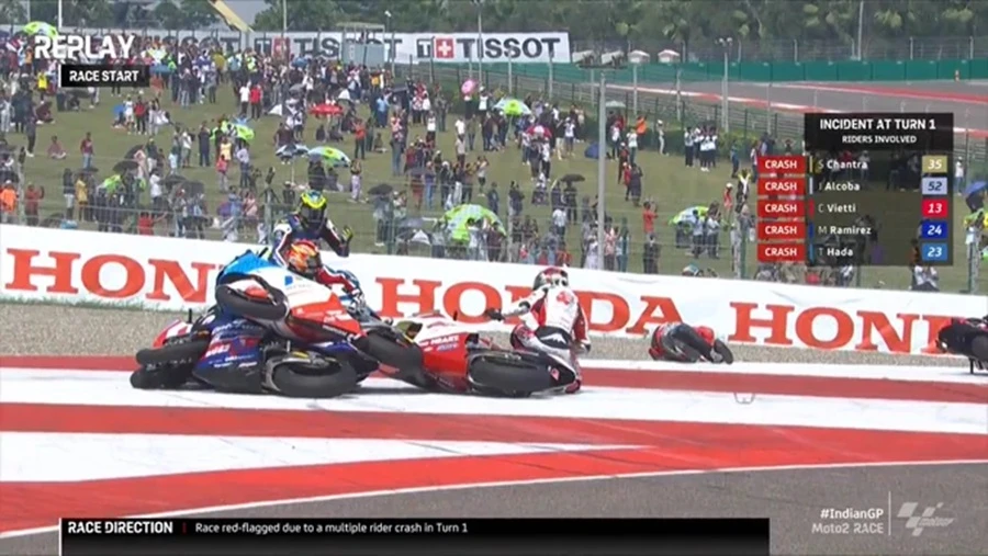 การแข่งขันครั้งแรกบนผืนแผ่นดินประเทศอินเดียเริ่มต้นขึ้นด้วยรอบ Tissot Sprint Race ในรายการ IndianOil Gran Prix of India เป็น Bezzecchi ที่ทำการคว้าโพลมาครองได้แต่ทันทีที่การแข่งขันเริ่มต้นขึ้นกลับกลายเป็น Martin ที่ออกตัวได้ดีกว่าพร้อมคว้าโฮลช็อตในโค้งที่ 1 อย่างไรก็ตามกลับมีเรื่องดราม่า ระหว่าง Bezzecchi และ Luca Marini คู่ทีมเมทจาก Mooney VR46 Racing Team ที่เกี่ยวกันทำให้ Marini ล้มลงจนได้รับบาดเจ็บจนถูกส่งตัวไปที่ศูนย์การแพทย์ โดยถูกตรวจพบกระดูกไหปลาร้าด้านซ้ายหัก (ทำให้ไม่ผ่านการตรวจความฟิตและพลาดการลงแข่งขันใน #IndianGP คาดว่าจะต้องรับโทษ Long Lap เมื่อกลับมาลงสนามด้วย) นอกจากนี้ก็ยังมี Pol Espargaro จาก GASGAS Factory Racing Tech3 ที่เกี่ยวกันกับ Stefan Bradl จาก LCR Honda CASTROL แล้มลงไปอีกคู่ด้วยนั่นเอง ซึ่งมีเพียง Bezzecchi คนเดียวที่กลับมาเข้าร่วมการแข่งขันได้