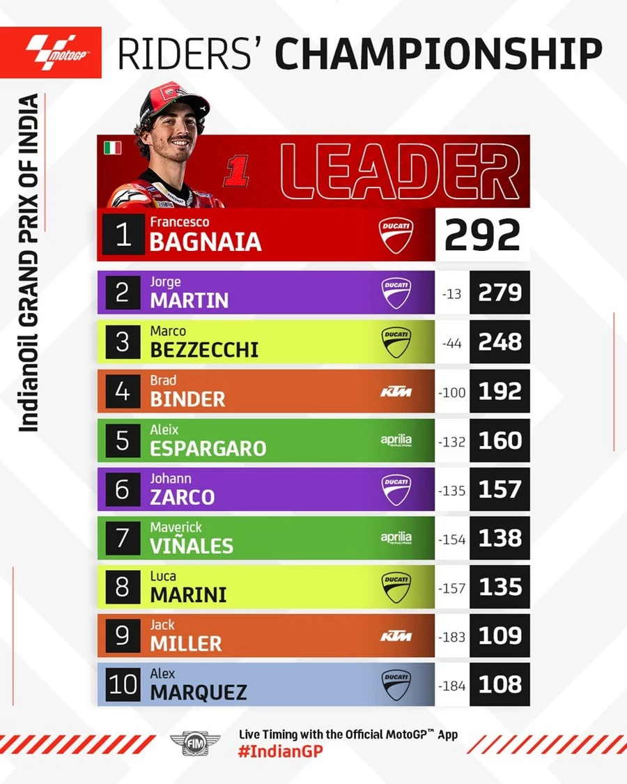 การลุ้นแชมป์ประจำปีของ MotoGP กลับมาสนุกอีกครั้ง หลังจบการแข่งขัน IndianOil Gran Prix of India เนื่องจากคะแนนสะสมของ Bagnaia นั้นนำ Martin อยู่เพียง 13 แต้ม ซึ่งสนามถัดไปเป็นสนามที่ 14 จะจัดขึ้นในญี่ปุ่น ที่สนาม Mobility Resort Motegi ในรายการ Motul Grand Prix Of Japan ในวันที่ 29 กันยายน - 1 ตุลาคม