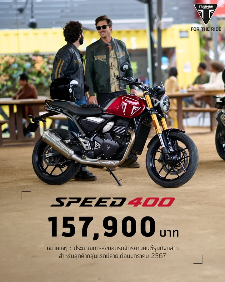 ไทรอัมพ์ มอเตอร์ไซเคิลส์ ผู้ผลิตรถจักรยานยนต์ชั้นนำสัญชาติอังกฤษ ประกาศราคาวางจำหน่ายทั่วโลก “Speed 400” และ “Scrambler 400 X” สองรถจักรยานยนต์ที่หลายคนตั้งตารอคอย โดยประเทศไทย “Speed 400” ราคาจำหน่ายอย่างเป็นทางการ 157,900 บาท ส่วน “Scrambler 400 X” ราคาจำหน่ายอย่างเป็นทางการ 179,900 บาท
