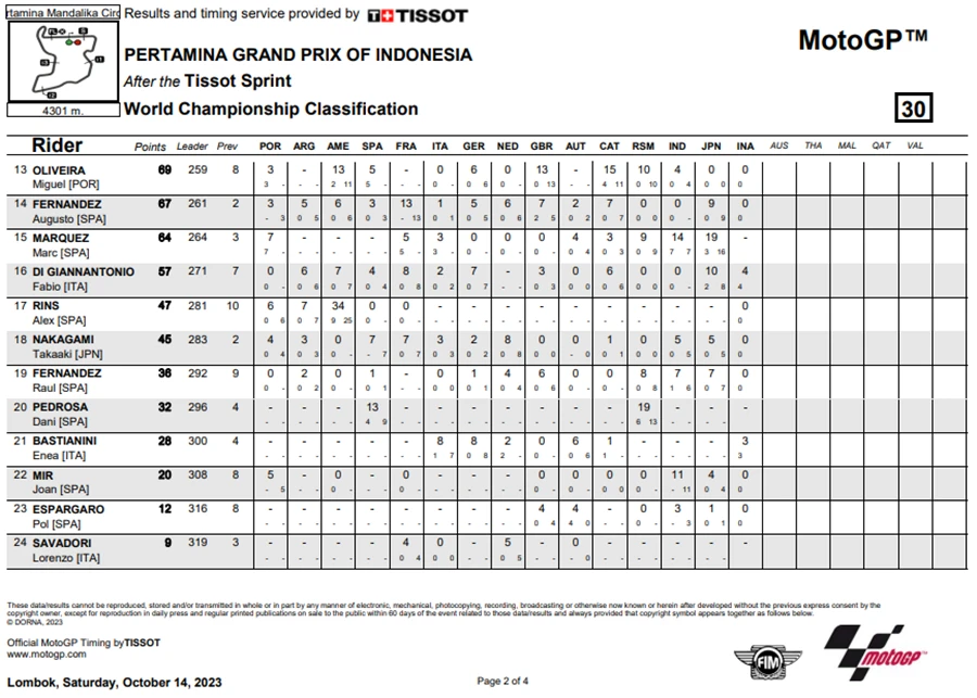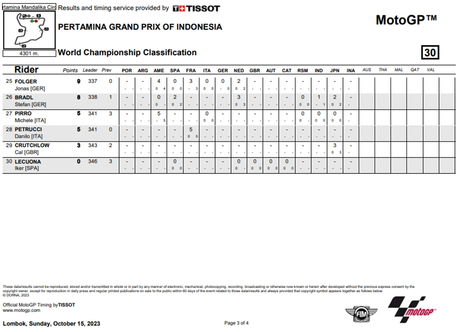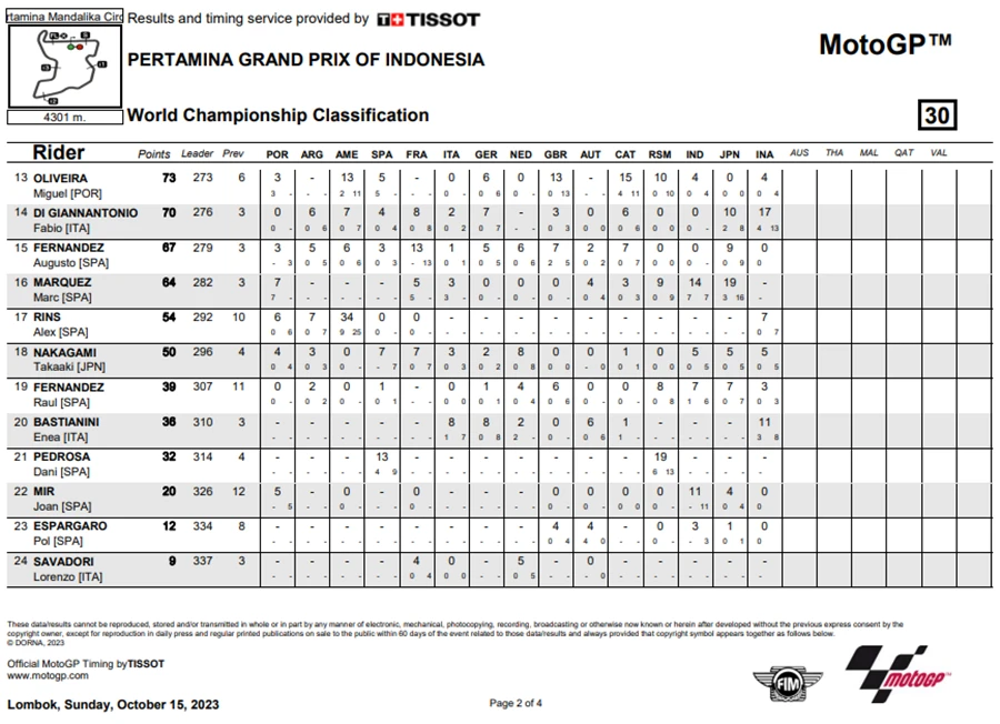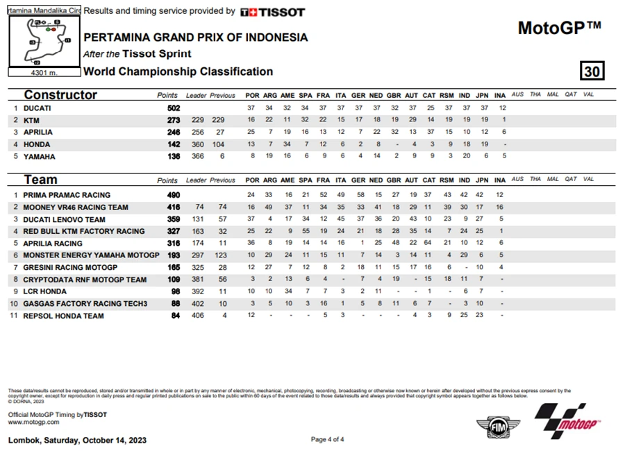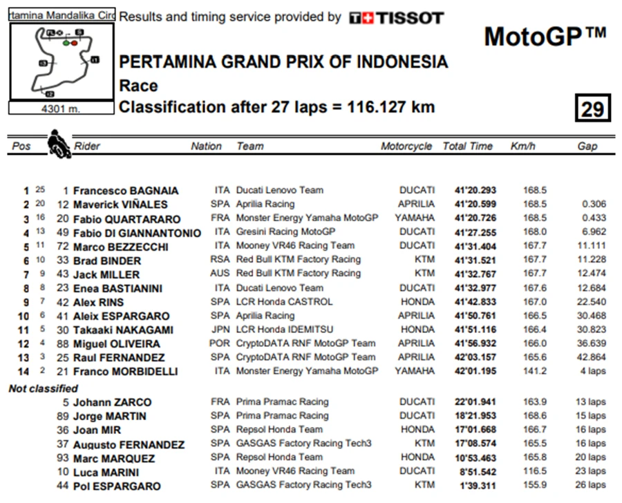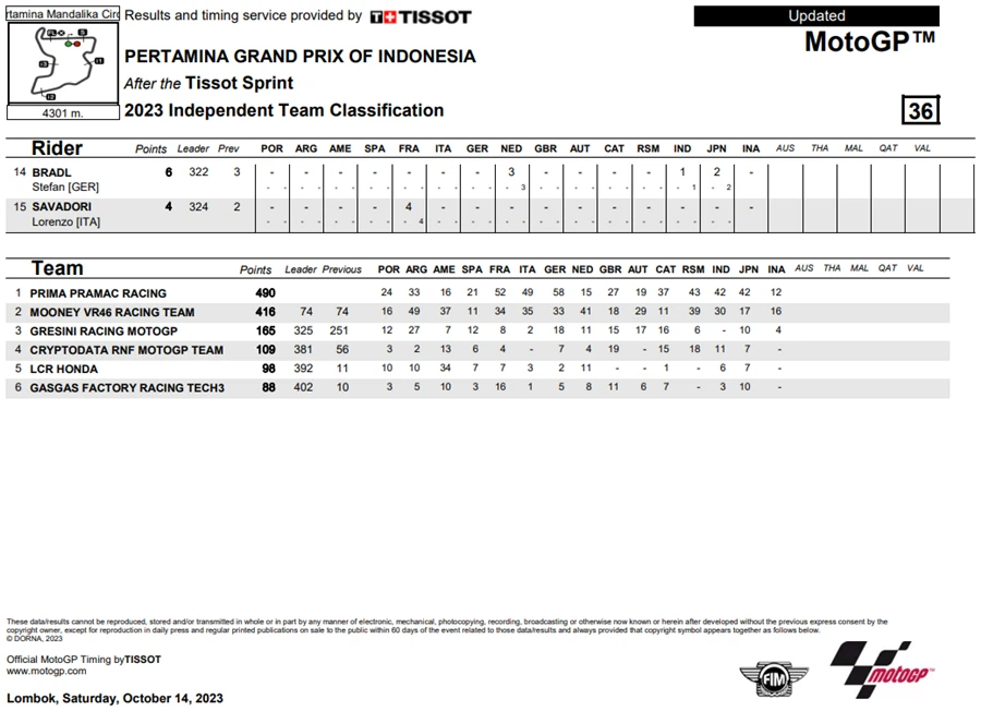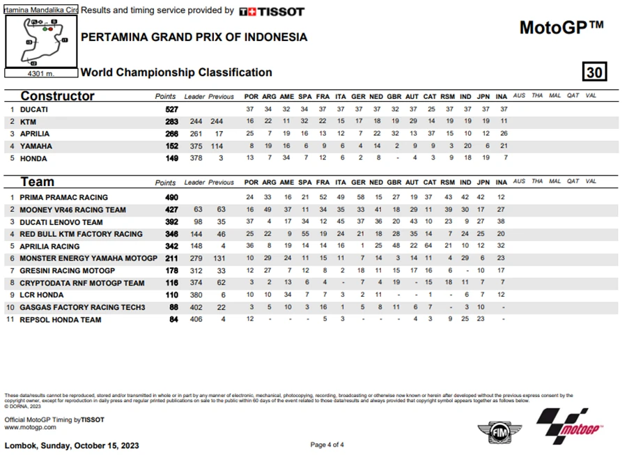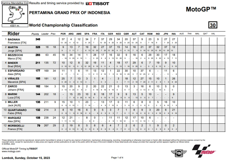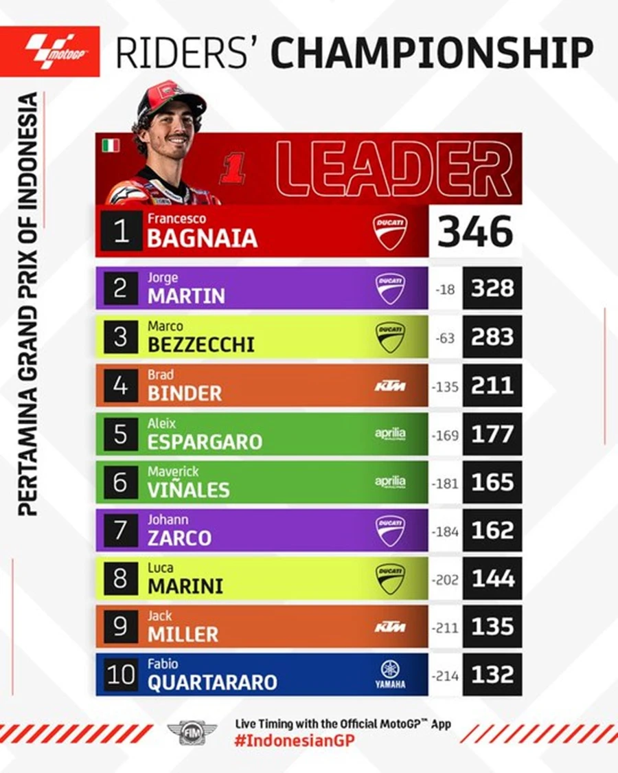 การแข่งขันในสนามที่ 15 ของ MotoGP 2023 เกิดขึ้นที่อินโดนีเซียในรายการ Pertamina Grand Prix of Indonesia ที่สนาม Pertamina Mandalika International Circuit เป็น Grand Prx ที่เรียกได้ว่าพลิกไปพลิกมาสุดๆ หลัง Jorge Martin จาก Prima Pramac Racing ที่คว้าชัยชนะได้ใน Tissot Sprint Race ขยับขึ้นมาเป็นผู้นำโดยทิ้งห่าง Francesco Bagnaia จาก Ducati Lenovo Team ถึง 7 แต้ม แต่พอเข้าสู่ช่วงเรซหลักก็พลิกอีกรอบหลัง Martin ที่นำห่างอยู่ถึง 2 วินาที อยู่ ๆ ก็ล้มไปดื้อ ๆ กลายเป็นโอกาสให้ Bagnaia สวนกลับขึ้นมาเป็นผู้นำคะแนนสะสมพร้อมทิ้งห่าง Martin ไปถึง 18 แต้มอีกด้วย