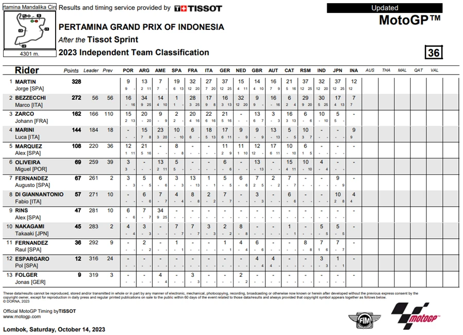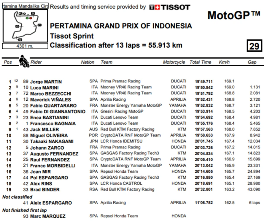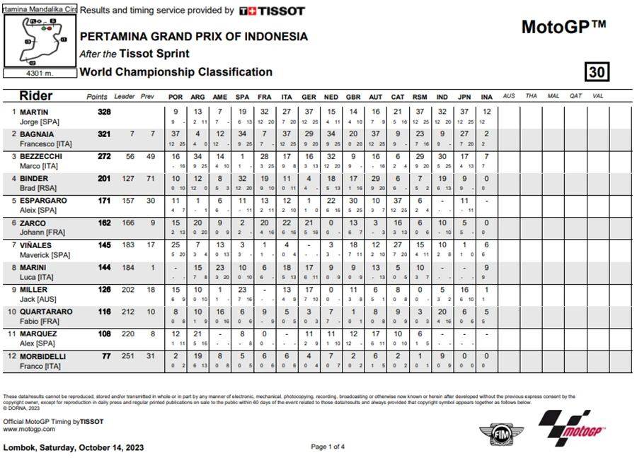 โดย Martin เปลี่ยนขึ้นมาเป็นผู้นำในคะแนนสะสมประจำฤดูกาล 2023 หลังคว้าชัยชนะได้ใน Tissot Sprint Race ซึ่งเป็นครั้งที่ 4 ของเจ้าตัว ทำให้มีคะแนนสะสมขึ้นนำ Bagnaia ถึง 7 แต้ม ส่วน Luca Marini และ Marco Bezzecchi คู่หูทีมเมทจาก Mooney VR46 Racing Team ก็ขี่ได้ดีโดยจบในอันดับ 2 และ 3 ตามลำดับ โดยทันทีที่ไฟสตาร์ทดับลง ก็ดูว่าความกดดันจะตกไปอยู่ที่ Bagnaia ที่ต้องออกตัวจากอันดับที่ 13 ส่วน Martin นั้นได้ออกตัวจากอันดับที่ 6
